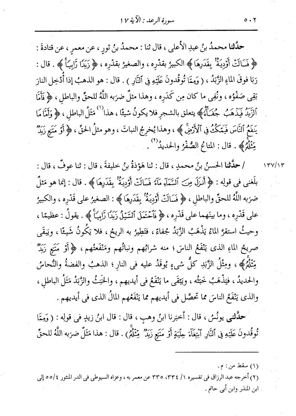 حَدَّثَنَا مُحَمَّدُ بْنُ عَبْدِ الْأَعْلَى قَالَ: ثنا مُحَمَّدُ بْنُ ثَوْرٍ، عَنْ مَعْمَرٍ، عَنْ قَتَادَةَ: {§فَسَالَتْ أَوْدِيَةٌ بِقَدَرِهَا} [الرعد: 17] الْكَبِيرُ بِقَدَرِهِ وَالصَّغِيرُ بِقَدَرِهِ {زَبَدًا رَابِيًا} [الرعد: 17] قَالَ: رَبَا فَوْقَ الْمَاءِ الزَّبَدُ {وَمِمَّا يُوقِدُونَ عَلَيْهِ فِي النَّارِ} [الرعد: 17] قَالَ: " هُوَ الذَّهَبُ إِذَا أُدْخِلَ النَّارَ بَقِيَ صَفْوهُ، وَنُفِيَ مَا كَانَ مِنْ كَدَرِهِ وَهَذَا مَثَلٌ ضَرَبَهُ اللَّهُ لِلْحَقِّ وَالْبَاطِلِ، {فَأَمَّا الزَّبَدُ فَيَذْهَبُ جُفَاءً} [الرعد: 17] يَتَعَلَّقُ بِالشَّجَرِ فَلَا يَكُونُ شَيْئًا مَثَلُ الْبَاطِلِ، {وَأَمَّا مَا يَنْفَعُ النَّاسَ فَيَمْكُثُ فِي الْأَرْضِ} [الرعد: 17] وَهَذَا يُخْرِجُ النَّبَاتَ، وَهُوَ مَثَلُ الْحَقِّ {أَوْ مَتَاعٍ زَبَدٌ مِثْلُهُ} [الرعد: 17] قَالَ: الْمَتَاعُ: الصُّفْرُ وَالْحَدِيدُ "