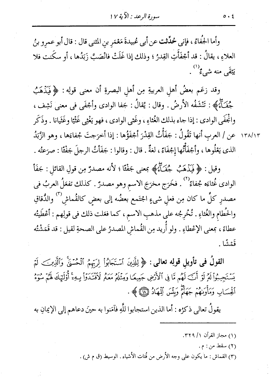 وَأَمَّا الْجُفَاءُ، فَإِنِّي حُدِّثْتُ، عَنْ أَبِي عُبَيْدَةَ مَعْمَرِ بْنِ الْمُثَنَّى قَالَ: قَالَ أَبُو عَمْرِو بْنُ الْعَلَاءِ: يُقَالُ: قَدْ أَجْفَأَتِ الْقِدْرُ، وَذَلِكَ إِذَا غَلَتْ فَانْصَبَّ زَبَدُهَا، أَوْ سَكَنَتْ فَلَا يَبْقَى مِنْهُ شَيْءٌ. وَقَدْ زَعَمَ بَعْضُ أَهْلِ الْعَرَبِيَّةِ مِنْ أَهْلِ الْبَصْرَةِ أَنَّ مَعْنَى قَوْلِهِ: {فَيَذْهَبُ جُفَاءً} [الرعد: 17] تَنْشَفُهُ الْأَرْضُ، وَقَالَ: يُقَالُ: جَفَا الْوَادِي وَأَجْفَى فِي مَعْنَى نَشِفَ، وَانْجَفَى الْوَادِي: إِذَا جَاءَ بِذَلِكَ الْغُثَاءِ، وَغَثَى الْوَادِي فَهُوَ يَغْثَى غَثْيًا وَغَثَيَانًا وَذَكَرَ عَنِ الْعَرَبِ أَنَّهَا تَقُولُ: جَفَأْتُ الْقِدْرَ أَجْفَؤُهَا: إِذَا أَخْرَجْتُ جُفَاءَهَا، وَهُوَ الزَّبَدُ الَّذِي يَعْلُوهَا، وَأَجْفَأْتُهَا إِجْفَاءً لُغَةً قَالَ: وَقَالُوا: جَفَأْتُ الرَّجُلَ جَفًا: صَرَعْتُهُ. وَقِيلَ: {فَيَذْهَبُ جُفَاءً} [الرعد: 17] بِمَعْنَى جَفْئًا، لِأَنَّهُ مَصْدَرٌ مِنْ قَوْلِ الْقَائِلِ: جَفَأَ الْوَادِي غُثَاءَهُ، فَخَرَجَ مَخْرَجَ الِاسْمِ وَهُوَ مَصْدَرٌ، كَذَلِكَ تَفْعَلُ الْعَرَبُ فِي مَصْدَرِ كُلِّ مَا كَانَ مِنْ فِعْلِ شَيْءٍ اجْتَمَعَ بَعْضُهُ إِلَى بَعْضٍ كَالْقُمَاشِ وَالدُّقَاقِ وَالْحُطَامِ وَالْغُثَاءِ، تُخْرِجُهُ عَلَى مَذْهَبِ الِاسْمِ، كَمَا فَعَلَتْ ذَلِكَ فِي قَوْلِهِمْ: أَعْطَيْتُهُ عَطَاءً، بِمَعْنَى الْإِعْطَاءِ، وَلَوْ أُرِيدَ مِنَ الْقُمَاشِ الْمَصْدَرُ عَلَى الصِّحَّةِ لَقِيلَ: قَدْ قَمَشْتُهُ قَمْشًا