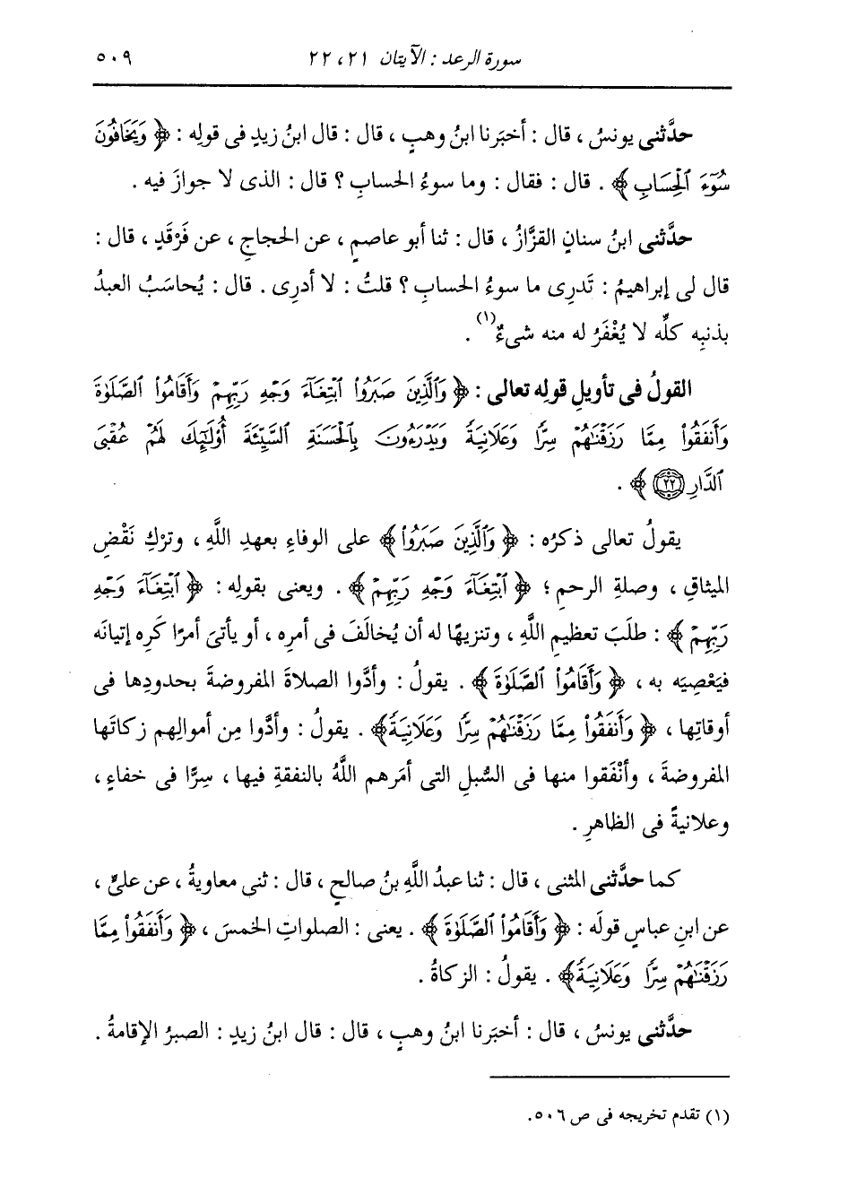 حَدَّثني الْمُثَنَّى، قَالَ: ثنا عَبْدُ اللَّهِ بْنُ صَالِحٍ، قَالَ: ثني مُعَاوِيَةُ، عَنْ عَلِيٍّ، عَنِ ابْنِ عَبَّاسٍ، قَوْلُهُ: " {§وَأَقَامُوا الصَّلَاةَ} [الرعد: 22] يَعْنِي الصَّلَوَاتِ الْخَمْسَ، {وَأَنْفَقُوا مِمَّا رَزَقْنَاهُمْ سِرًّا وَعَلَانِيَةً} [الرعد: 22] يَقُولُ الزَّكَاةُ "