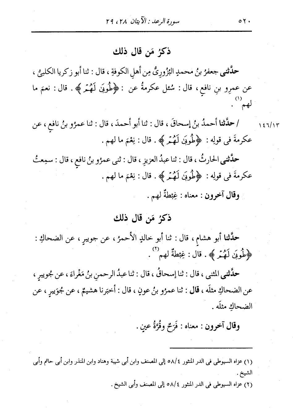 ذِكْرُ مَنْ قَالَ ذَلِكَ: حَدَّثَنَا أَبُو هِشَامٍ، قَالَ: ثنا أَبُو خَالِدٍ الْأَحْمَرُ، عَنْ جُوَيْبِرٍ، عَنِ الضَّحَّاكِ: {§طُوبَى لَهُمْ} [الرعد: 29] قَالَ: " غِبْطَةٌ لَهُمْ. حَدَّثني الْمُثَنَّى قَالَ: ثنا إِسْحَاقُ قَالَ: ثنا عَبْدُ الرَّحْمَنِ بْنُ مَغْرَاءَ، عَنْ جُوَيْبِرٍ، عَنِ الضَّحَّاكِ، مِثْلَهُ. قَالَ: ثنا عَمْرُو بْنُ عَوْنٍ قَالَ: أَخْبَرَنَا هُشَيْمٌ، عَنْ جُوَيْبِرٍ، عَنِ الضَّحَّاكِ، مِثْلَهُ. وَقَالَ آخَرُونَ: مَعْنَاهُ: فَرَحٌ وَقُرَّةُ عَيْنٍ