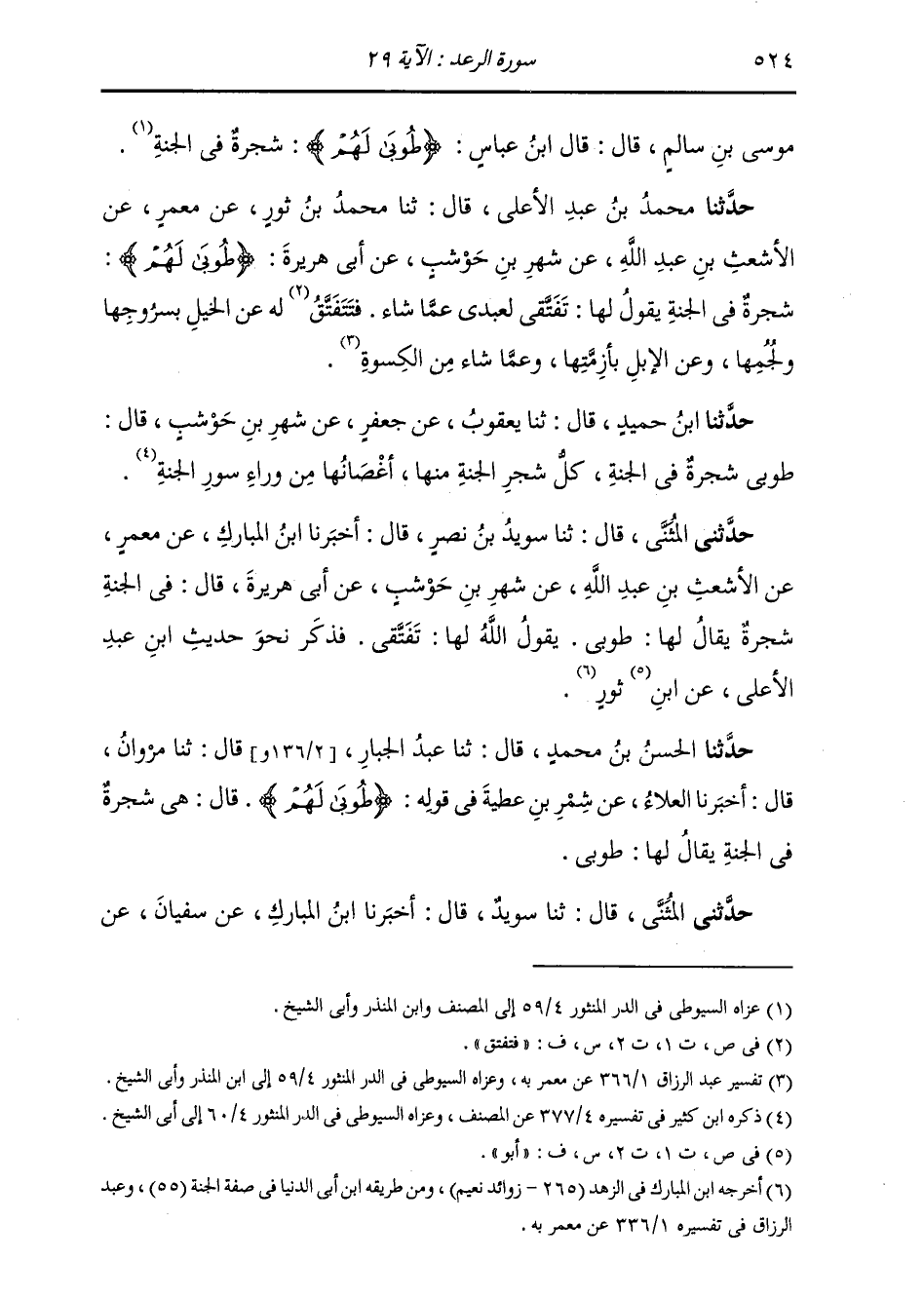 حَدَّثَنَا مُحَمَّدُ بْنُ عَبْدِ الْأَعْلَى، قَالَ: ثنا مُحَمَّدُ بْنُ ثَوْرٍ، عَنْ مَعْمَرٍ، عَنِ الْأَشْعَثِ بْنِ عَبْدِ اللَّهِ، عَنْ شَهْرِ بْنِ حَوْشَبٍ، عَنْ أَبِي هُرَيْرَةَ: {§طُوبَى لَهُمْ} [الرعد: 29] : " شَجَرَةٌ فِي الْجَنَّةِ يَقُولُ لَهَا: تَفَتَّقِي لِعَبْدِي عَمَّا شَاءَ فَتَتَفَتَّقُ لَهُ عَنِ الْخَيْلِ بِسُرُوجِهَا وَلُجُمِهَا، وَعَنِ الْإِبِلِ بِأَزِمَّتِهَا، وَعَمَّا شَاءَ مِنَ الْكِسْوَةِ "