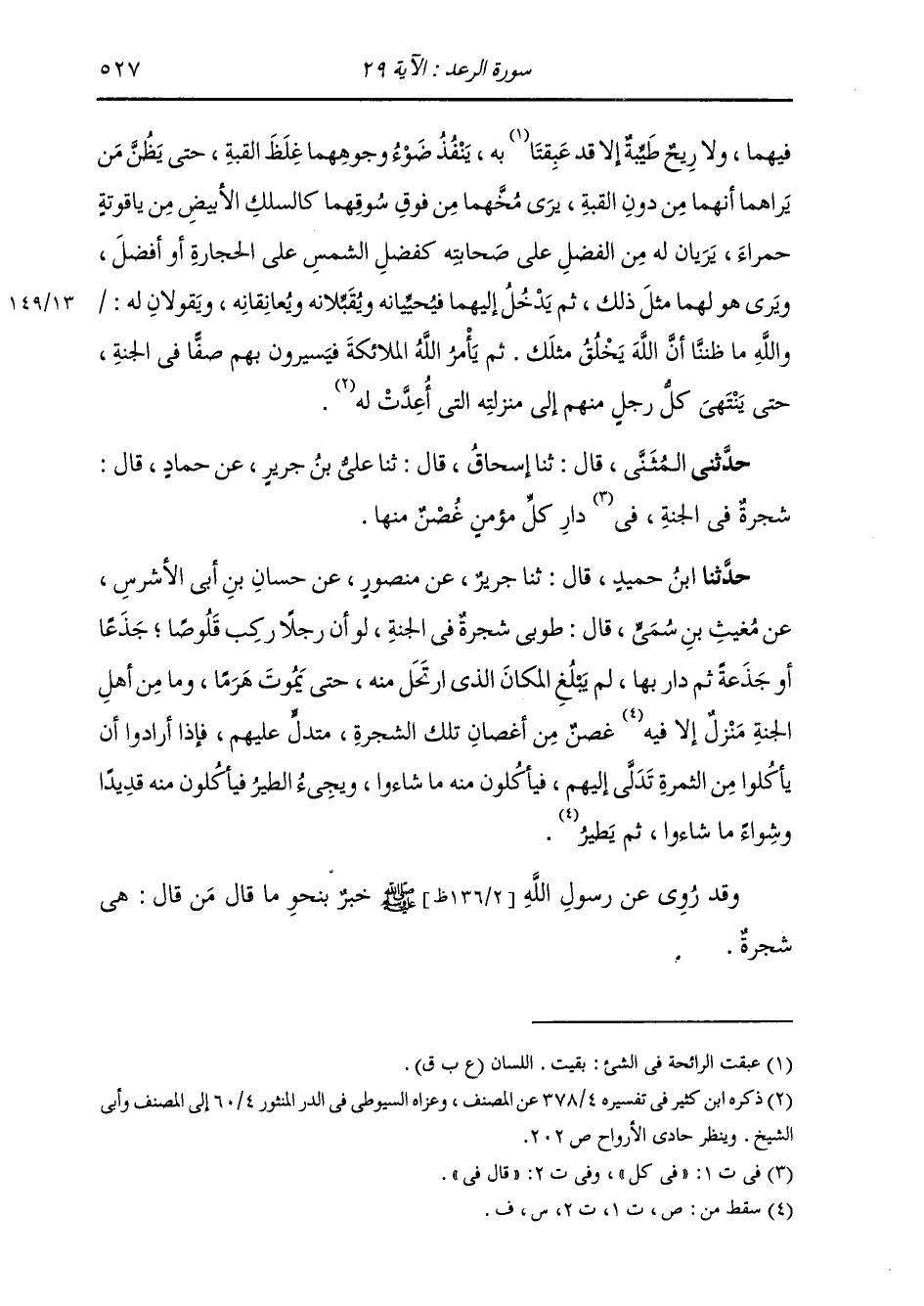 حَدَّثني الْمُثَنَّى، قَالَ: ثنا إِسْحَاقُ، قَالَ: ثنا عَلِيُّ بْنُ جَرِيرٍ، عَنْ حَمَّادٍ، قَالَ: «§شَجَرَةُ فِي الْجَنَّةِ، فِي دَارِ كُلِّ مُؤْمِنٍ غُصْنٌ مِنْهَا»