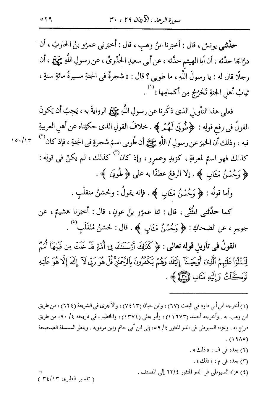 حَدَّثني يُونُسُ، قَالَ: أَخْبَرَنَا ابْنُ وَهْبٍ، قَالَ: أَخْبَرَنِي عَمْرُو بْنُ الْحَارِثِ، أَنَّ دَرَّاجًا حَدَّثَهُ أَنَّ أَبَا الْهَيْثَمِ حَدَّثَهُ عَنْ أَبِي سَعِيدٍ الْخُدْرِيِّ، عَنْ رَسُولِ اللَّهِ صَلَّى اللهُ عَلَيْهِ وَسَلَّمَ: أَنَّ رَجُلًا قَالَ لَهُ: يَا رَسُولَ اللَّهِ، §مَا طُوبَى؟ قَالَ: «شَجَرَةٌ فِي الْجَنَّةِ مَسِيرَةَ مِائَةِ سَنَةٍ، ثِيَابُ أَهْلِ الْجَنَّةِ تَخْرُجُ مِنْ أَكْمَامِهَا» . فَعَلَى هَذَا التَّأْوِيلِ الَّذِي ذَكَرْنَا عَنْ رَسُولِ اللَّهِ صَلَّى اللهُ عَلَيْهِ وَسَلَّمَ الرِّوَايَةَ بِهِ، يَجِبُ أَنْ يَكُونَ الْقَوْلُ فِي رَفْعِ قَوْلِهِ: {طُوبَى لَهُمْ} [الرعد: 29] خِلَافُ الْقَوْلِ الَّذِي حَكَيْنَاهُ عَنْ أَهْلِ الْعَرَبِيَّةِ فِيهِ، وَذَلِكَ أَنَّ الْخَبَرَ عَنْ رَسُولِ اللَّهِ صَلَّى اللهُ عَلَيْهِ وَسَلَّمَ أَنَّ طُوبَى اسْمُ شَجَرَةٍ فِي الْجَنَّةِ، فَإِذَا كَانَ كَذَلِكَ فَهُوَ اسْمٌ لِمَعْرِفَةٍ كَزَيْدٍ وَعَمْرٍو، وَإِذَا كَانَ ذَلِكَ كَذَلِكَ، لَمْ يَكُنْ فِي قَوْلِهِ: {وَحُسْنُ مَآبٍ} [الرعد: 29] إِلَّا الرَّفْعُ عَطْفًا بِهِ عَلَى «طُوبَى»