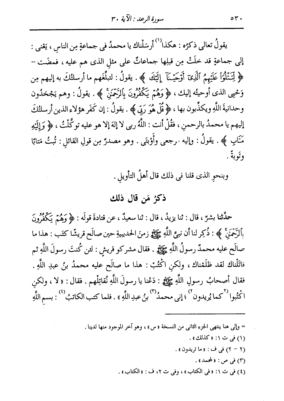 ذِكْرُ مَنْ قَالَ ذَلِكَ: حَدَّثَنَا بِشْرٌ، قَالَ: ثنا يَزِيدُ، قَالَ: ثنا سَعِيدٌ، عَنْ قَتَادَةَ، قَوْلُهُ: {§وَهُمْ يَكْفُرُونَ بِالرَّحْمَنِ} [الرعد: 30] : ذُكِرَ لَنَا أَنَّ نَبِيَّ اللَّهِ صَلَّى اللهُ عَلَيْهِ وَسَلَّمَ زَمَنَ الْحُدَيْبِيَةِ حِينَ صَالَحَ قُرَيْشًا كَتَبَ: «هَذَا مَا صَالَحَ عَلَيْهِ مُحَمَّدٌ رَسُولُ اللَّهِ» فَقَالَ مُشْرِكُو قُرَيْشٍ: لَئِنْ كُنْتَ رَسُولَ اللَّهِ صَلَّى اللهُ عَلَيْهِ وَسَلَّمَ ثُمَّ قَاتَلْنَاكَ لَقَدْ ظَلَمْنَاكَ، وَلَكِنِ اكْتُبْ: هَذَا مَا صَالَحَ عَلَيْهِ مُحَمَّدُ بْنُ عَبْدِ اللَّهِ، فَقَالَ أَصْحَابُ رَسُولِ اللَّهِ صَلَّى اللهُ عَلَيْهِ وَسَلَّمَ: دَعْنَا يَا رَسُولَ اللَّهِ نُقَاتِلْهُمْ فَقَالَ: «لَا، وَلَكِنِ اكْتُبُوا كَمَا يُرِيدُونَ، إِنِّي مُحَمَّدُ بْنُ عَبْدِ اللَّهِ» فَلَمَّا كَتَبَ الْكَاتِبُ: «بِسْمِ اللَّهِ -[531]- الرَّحْمَنِ الرَّحِيمِ» قَالَتْ قُرَيْشٌ: أَمَّا الرَّحْمَنُ فَلَا نَعْرِفُهُ، وَكَانَ أَهْلُ الْجَاهِلِيَّةِ يَكْتُبُونَ: «بِاسْمِكَ اللَّهُمَّ» ، فَقَالَ أَصْحَابُهُ: يَا رَسُولَ اللَّهِ، دَعْنَا نُقَاتِلْهُمْ، قَالَ: «لَا، وَلَكِنِ اكْتُبُوا كَمَا يُرِيدُونَ»