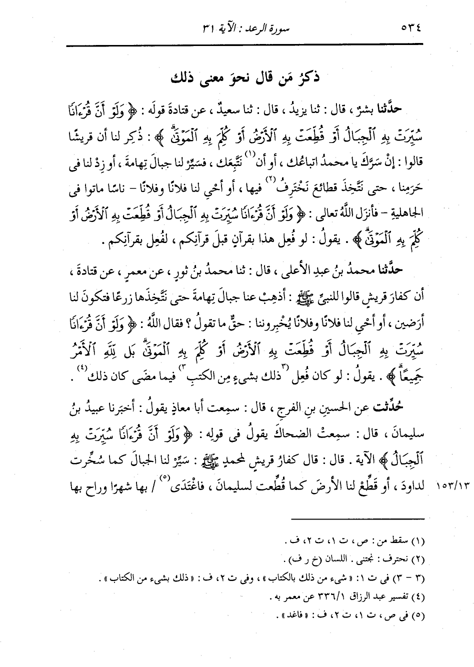 حَدَّثَنَا مُحَمَّدُ بْنُ عَبْدِ الْأَعْلَى قَالَ: ثنا مُحَمَّدُ بْنُ ثَوْرٍ، عَنْ مَعْمَرٍ، عَنْ قَتَادَةَ: " أَنَّ كُفَّارَ قُرَيْشٍ قَالُوا لِلنَّبِيِّ صَلَّى اللهُ عَلَيْهِ وَسَلَّمَ: أَذْهِبْ عَنَّا جِبَالَ تِهَامَةَ حَتَّى نَتَّخِذَهَا زَرْعًا فَتَكُونَ لَنَا أَرَضِينَ، أَوْ أَحْيِ لَنَا فُلَانًا وَفُلَانًا يُخْبِرُونَنَا حَقَّ مَا تَقُولُ فَقَالَ اللَّهُ: {§وَلَوْ أَنَّ قُرْآنًا سُيِّرَتْ بِهِ الْجِبَالُ، أَوْ قُطِّعَتْ بِهِ الْأَرْضُ، أَوْ كُلِّمَ بِهِ الْمَوْتَى، بَلْ للَّهِ الْأَمْرُ جَمِيعًا} [الرعد: 31] يَقُولُ: «لَوْ كَانَ فَعَلَ ذَلِكَ بِشَيْءٍ مِنَ الْكُتُبِ فِيمَا مَضَى كَانَ ذَلِكَ»
