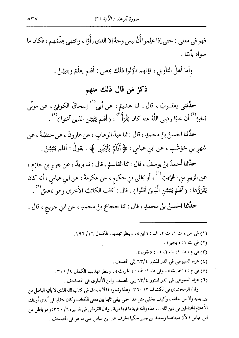 حَدَّثَنَا أَحْمَدُ بْنُ يُوسُفَ، قَالَ: ثنا الْقَاسِمُ، قَالَ: ثنا يَزِيدُ، عَنْ جَرِيرِ بْنِ حَازِمٍ، عَنِ الزُّبَيْرِ بْنِ الْحَارِثِ، أَوْ يَعْلَى بْنِ حَكِيمٍ، عَنْ عِكْرِمَةَ، عَنِ ابْنِ عَبَّاسٍ، أَنَّهُ §كَانَ يَقْرَؤُهَا: «أَفَلَمْ يَتَبَيَّنِ الَّذِينَ آمَنُوا» قَالَ: «كَتَبَ الْكَاتِبُ الْأُخْرَى وَهُوَ نَاعِسٌ»