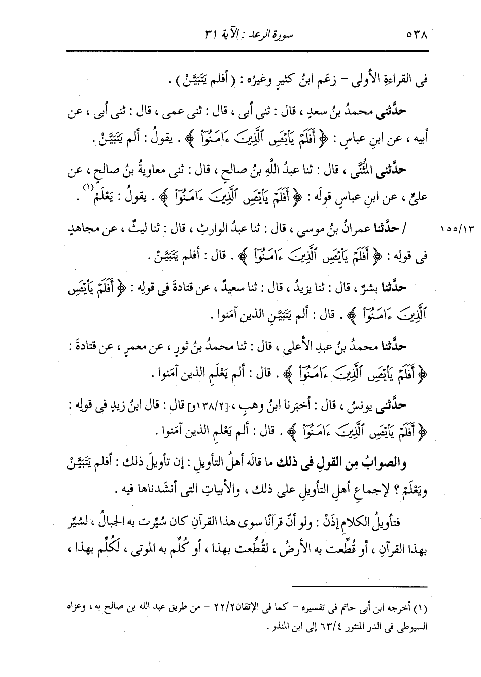 حَدَّثني الْمُثَنَّى قَالَ: ثنا عَبْدُ اللَّهِ بْنُ صَالِحٍ قَالَ: ثني مُعَاوِيَةُ بْنُ صَالِحٍ، عَنْ عَلِيٍّ، عَنِ ابْنِ عَبَّاسٍ قَوْلُهُ: " {§أَفَلَمْ يَيْأَسِ الَّذِينَ آمَنُوا} [الرعد: 31] يَقُولُ: يَعْلَمُ "