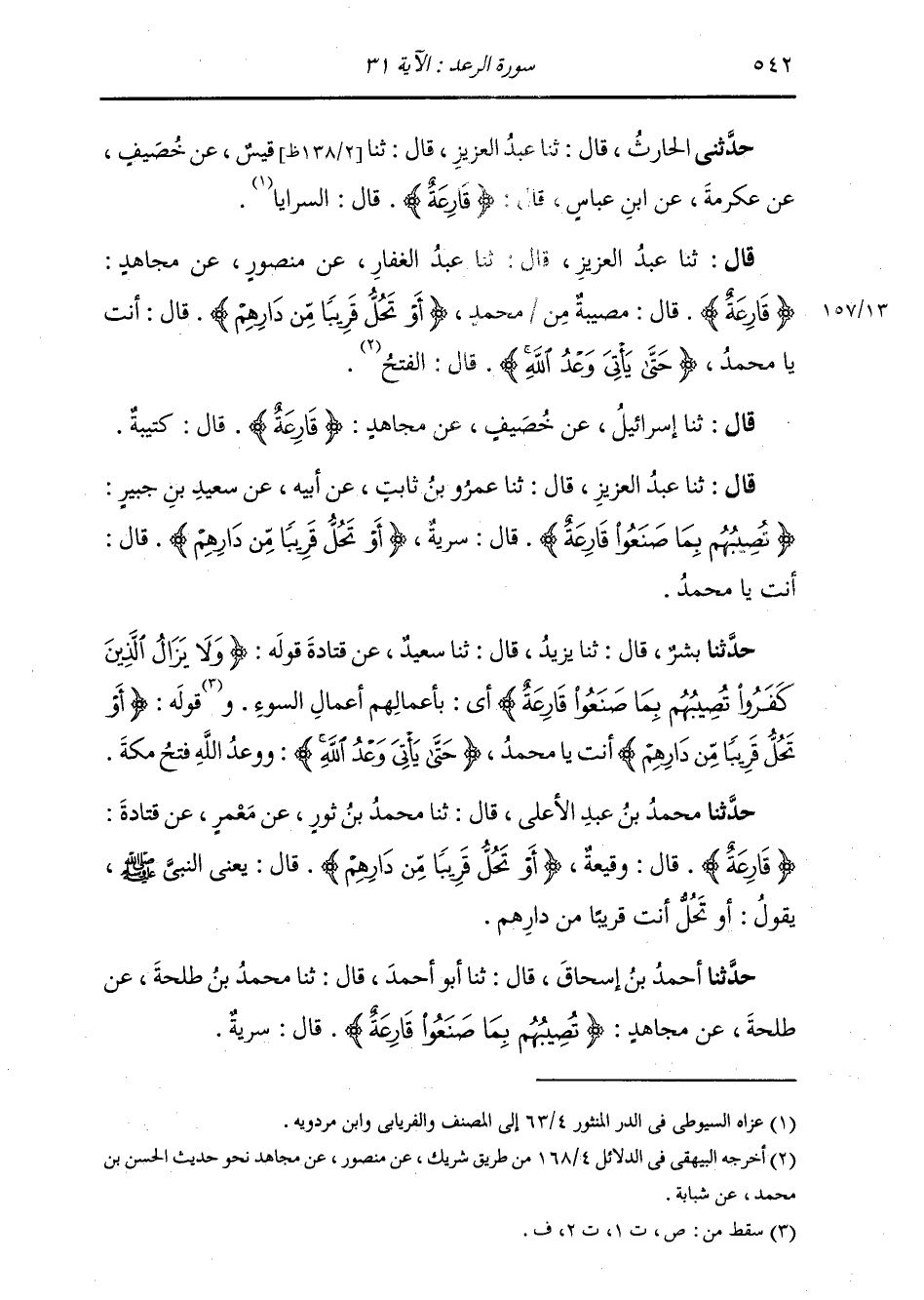 حَدَّثني الْحَارِثُ، قَالَ: ثنا عَبْدُ الْعَزِيزِ، قَالَ: ثنا قَيْسٌ، عَنْ خُصَيْفٍ، عَنْ عِكْرِمَةَ، عَنِ ابْنِ عَبَّاسٍ: قَالَ: " {§قَارِعَةٌ} [الرعد: 31] ، قَالَ: السَّرَايَا "