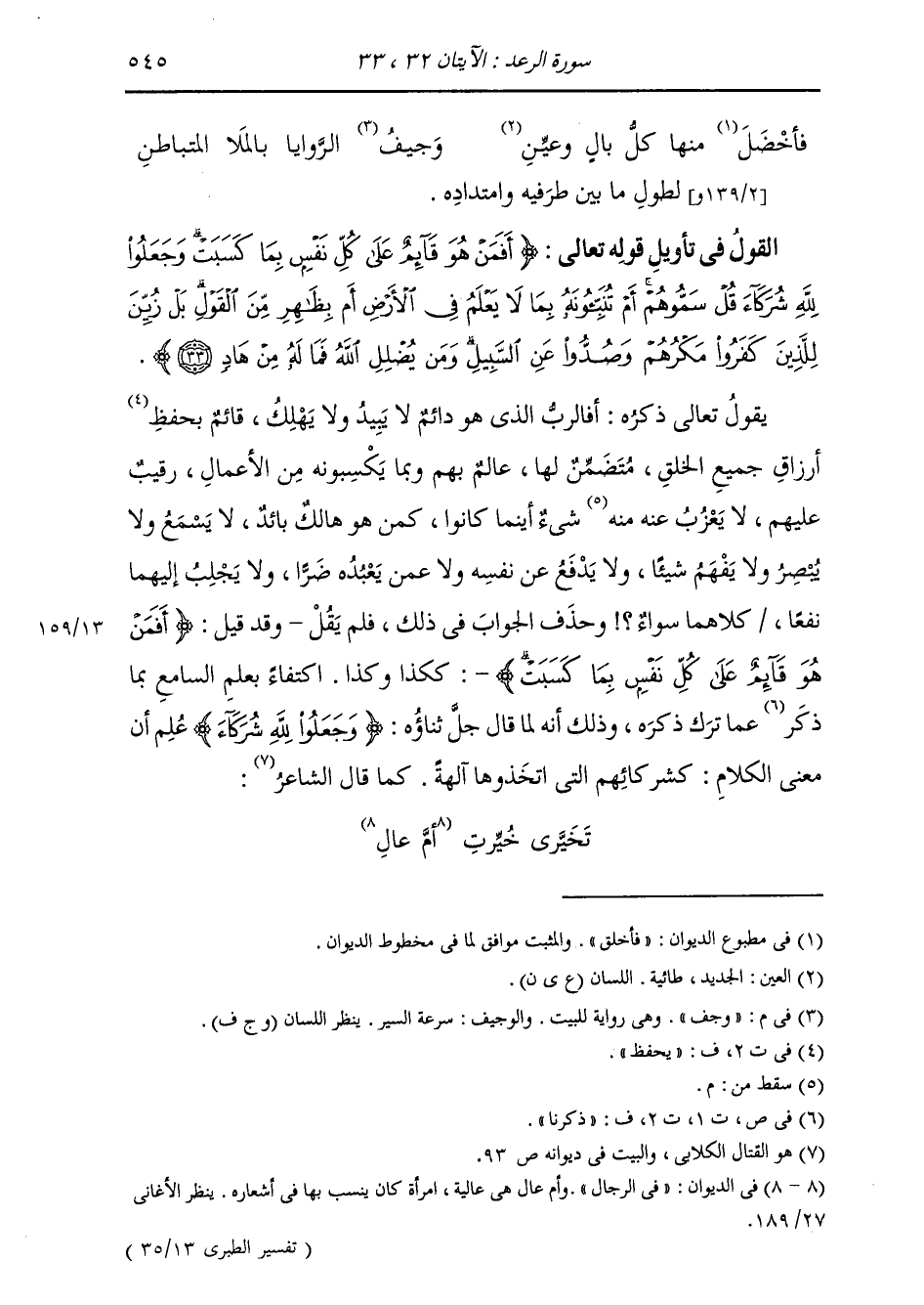 §الْقَوْلُ فِي تَأْوِيلِ قَوْلِهِ تَعَالَى: {أَفَمَنْ هُوَ قَائِمٌ عَلَى كُلِّ نَفْسٍ بِمَا كَسَبَتْ، وَجَعَلُوا للَّهِ شُرَكَاءَ، قُلْ سَمُّوهُمْ، أَمْ تُنَبِّئُونَهُ بِمَا لَا يَعْلَمُ فِي الْأَرْضِ أَمْ بِظَاهِرٍ مِنَ الْقَوْلِ، بَلْ زُيِّنَ لِلَّذِينَ كَفَرُوا مَكْرُهُمْ وَصُدُّوا عَنِ السَّبِيلِ، وَمَنْ يُضْلِلِ اللَّهُ فَمَا لَهُ مِنْ هَادٍ} [الرعد: 33] يَقُولُ تَعَالَى ذِكْرُهُ: أَفَالرَّبُّ الَّذِي هُوَ دَائِمٌ لَا يَبِيدُ وَلَا يَهْلِكُ قَائِمٌ بِحِفْظِ أَرْزَاقِ جَمِيعِ الْخَلْقِ، مُتَضَمِّنٌ لَهَا، عَالِمٌ بِهِمْ وَبِمَا يَكْسَبُونَهُ مِنَ الْأَعْمَالِ، رَقِيبٌ عَلَيْهِمْ، لَا يَعْزُبُ عَنْهُ شَيْءٌ أَيْنَمَا كَانُوا، كَمَنْ هُوَ هَالِكٌ بَائِدٌ لَا يَسْمَعُ وَلَا يُبْصِرُ وَلَا يَفْهَمُ شَيْئًا، وَلَا يَدْفَعُ عَنْ نَفْسِهِ وَلَا عَمَّنْ يَعْبُدُهُ ضَرًّا، وَلَا يَجْلِبُ إِلَيْهِمَا نَفْعًا؟ كِلَاهُمَا سَوَاءٌ؟ وَحُذِفَ الْجَوَابُ فِي ذَلِكَ فَلَمْ يُقَلْ، وَقَدْ قِيلَ {أَفَمَنْ هُوَ قَائِمٌ عَلَى كُلِّ نَفْسٍ بِمَا كَسَبَتْ} [الرعد: 33] كَكَذَا وَكَذَا، اكْتِفَاءً بِعِلْمِ السَّامِعِ بِمَا ذُكِرَ عَمَّا تُرِكَ ذِكْرُهُ، وَذَلِكَ أَنَّهُ لَمَّا قَالَ جَلَّ ثَنَاؤُهُ: {وَجَعَلُوا للَّهِ شُرَكَاءَ} [الأنعام: 100] عَلِمَ أَنَّ مَعْنَى الْكَلَامِ كَشُرَكَائِهِمُ الَّتِي اتَّخَذُوهَا آلِهَةً، كَمَا قَالَ الشَّاعِرُ: