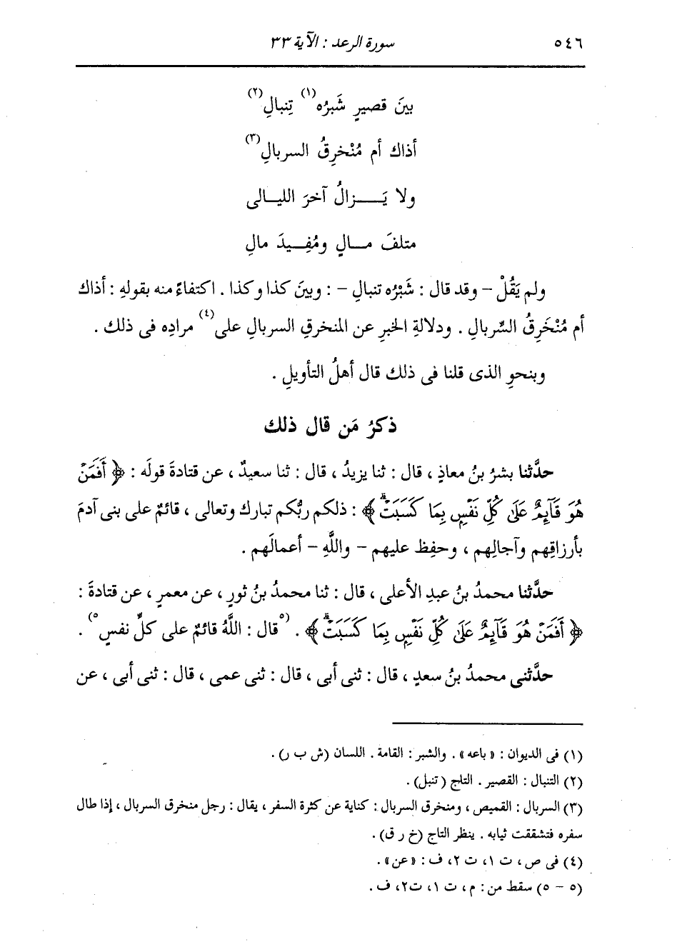 وَلَمْ يَقُلْ: وَقَدْ قَالَ: «شَبْرُهُ تِنْبَالِ» وَبَيْنَ كَذَا وَكَذَا، اكْتِفَاءً مِنْهُ بِقَوْلِ: أَذَاكَ أَمْ مُنْخَرِقُ السِّرْبَالِ، وَدَلَالَةُ الْخَبَرِ عَنِ الْمُنْخَرِقِ السِّرْبَالِ عَلَى مُرَادِهِ فِي ذَلِكَ. وَبِنَحْوِ الَّذِي قُلْنَا فِي ذَلِكَ قَالَ أَهْلُ التَّأْوِيلِ
