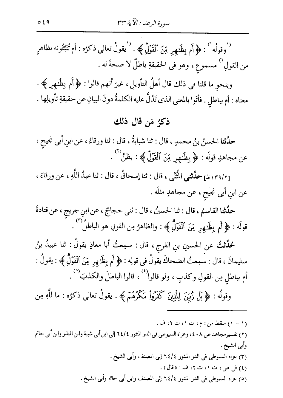 حُدِّثْتُ عَنِ الْحُسَيْنِ بْنِ الْفَرَجِ، قَالَ: سَمِعْتُ أَبَا مُعَاذٍ، يَقُولُ: ثنا عُبَيْدُ بْنُ سُلَيْمَانَ، قَالَ: سَمِعْتُ الضَّحَّاكَ، فِي قَوْلِهِ: {§أَمْ بِظَاهِرٍ مِنَ الْقَوْلِ} [الرعد: 33] يَقُولُ: أَمْ بِبَاطِلٍ مِنَ الْقَوْلِ وَكَذِبٍ، وَلَوْ قَالُوا، قَالُوا الْبَاطِلَ وَالْكَذِبَ "