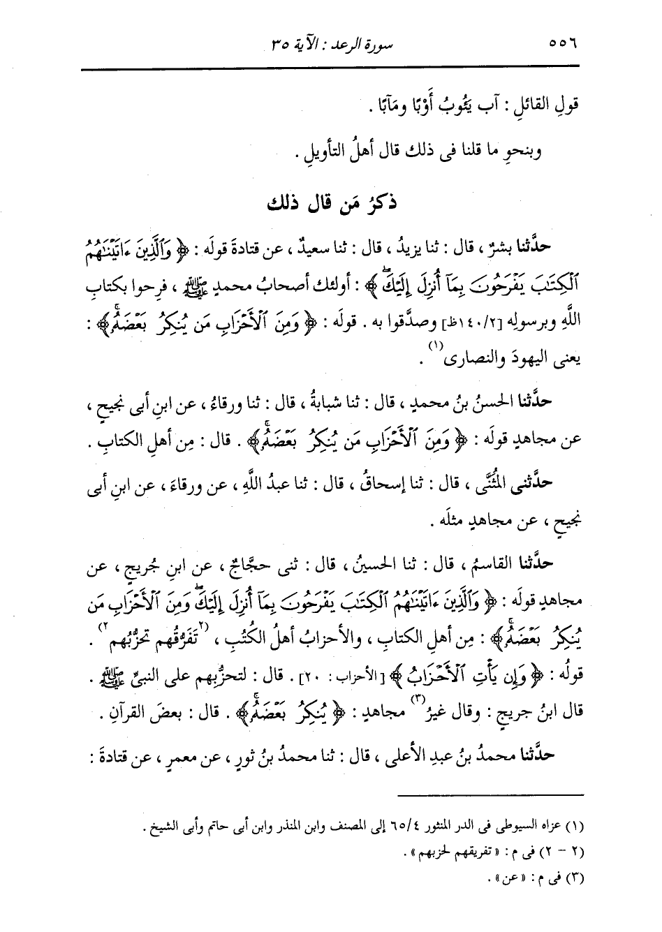 ذِكْرُ مَنْ قَالَ ذَلِكَ: حَدَّثَنَا بِشْرٌ، قَالَ: ثنا يَزِيدُ، قَالَ: ثنا سَعِيدٌ، عَنْ قَتَادَةَ، قَوْلُهُ: {§وَالَّذِينَ آتَيْنَاهُمُ الْكِتَابَ يَفْرَحُونَ بِمَا أُنْزِلَ إِلَيْكَ} [الرعد: 36] " أُولَئِكَ أَصْحَابُ مُحَمَّدٍ صَلَّى اللهُ عَلَيْهِ وَسَلَّمَ، فَرِحُوا بِكِتَابِ اللَّهِ وَبِرَسُولِهِ وَصَدَّقُوا بِهِ. قَوْلُهُ: {وَمِنَ الْأَحْزَابِ مَنْ يُنْكِرُ بَعْضُهُ} [الرعد: 36] يَعْنِي الْيَهُودَ وَالنَّصَارَى "
