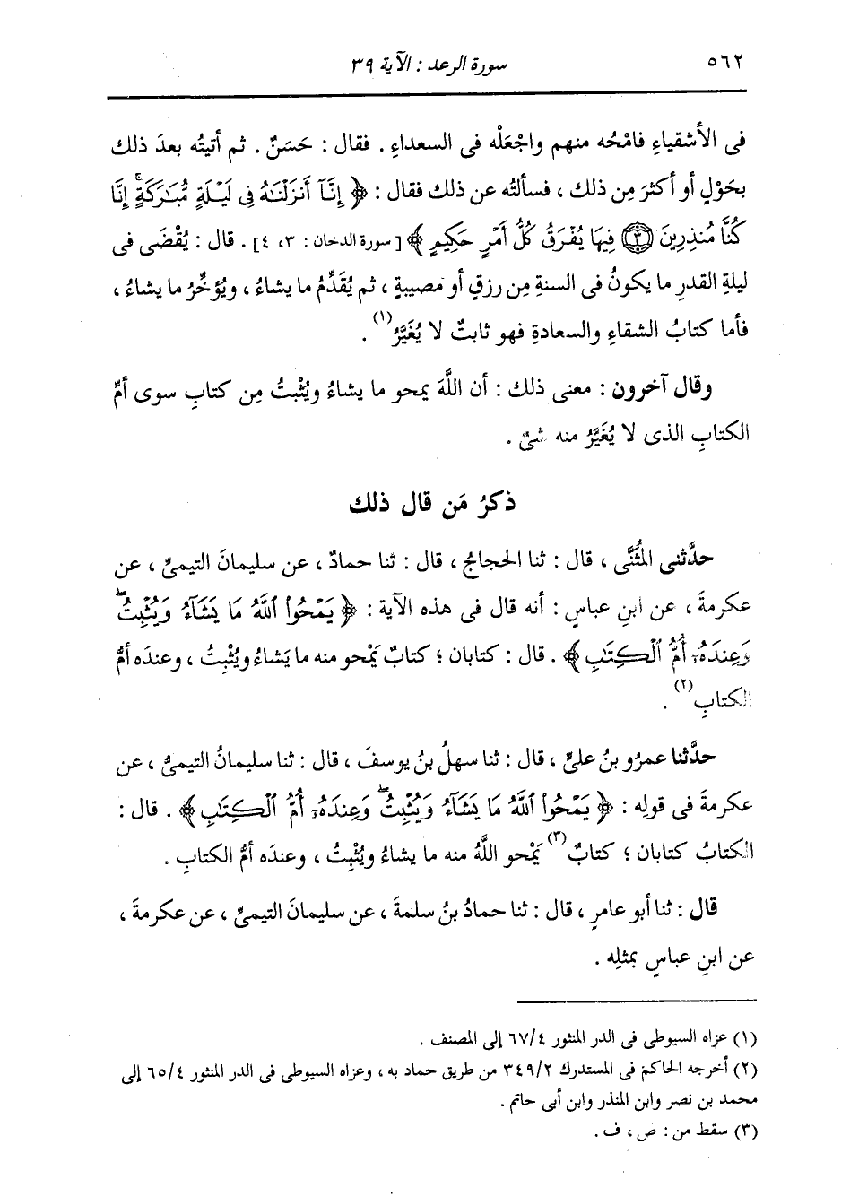 ذِكْرُ مَنْ قَالَ ذَلِكَ: حَدَّثني الْمُثَنَّى، قَالَ: ثنا الْحَجَّاجُ، قَالَ: ثنا حَمَّادٌ، عَنْ سُلَيْمَانَ التَّيْمِيِّ، عَنْ عِكْرِمَةَ، عَنِ ابْنِ عَبَّاسٍ، أَنَّهُ قَالَ فِي هَذِهِ الْآيَةِ: {§يَمْحُو اللَّهُ مَا يَشَاءُ وَيُثْبِتُ وَعِنْدَهُ أُمُّ الْكِتَابِ} [الرعد: 39] قَالَ: " كِتَابَانِ: كِتَابٌ يَمْحُو مِنْهُ مَا يَشَاءُ وَيُثْبِتُ، وَعِنْدَهُ أُمُّ الْكِتَابِ "