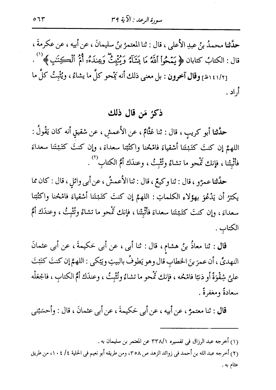 حَدَّثَنَا مُحَمَّدُ بْنُ عَبْدِ الْأَعْلَى قَالَ: ثنا الْمُعْتَمِرُ بْنُ سُلَيْمَانَ، عَنْ أَبِيهِ، عَنْ عِكْرِمَةَ قَالَ: «§الْكِتَابُ كِتَابَانِ يَمْحُو اللَّهُ مَا يَشَاءُ وَيُثْبِتُ، وَعِنْدَهُ أُمُّ الْكِتَابِ» . وَقَالَ آخَرُونَ: بَلْ مَعْنَى ذَلِكَ أَنَّهُ يَمْحُو كُلَّ مَا يَشَاءُ، وَيُثْبِتُ كُلَّ مَا أَرَادَ