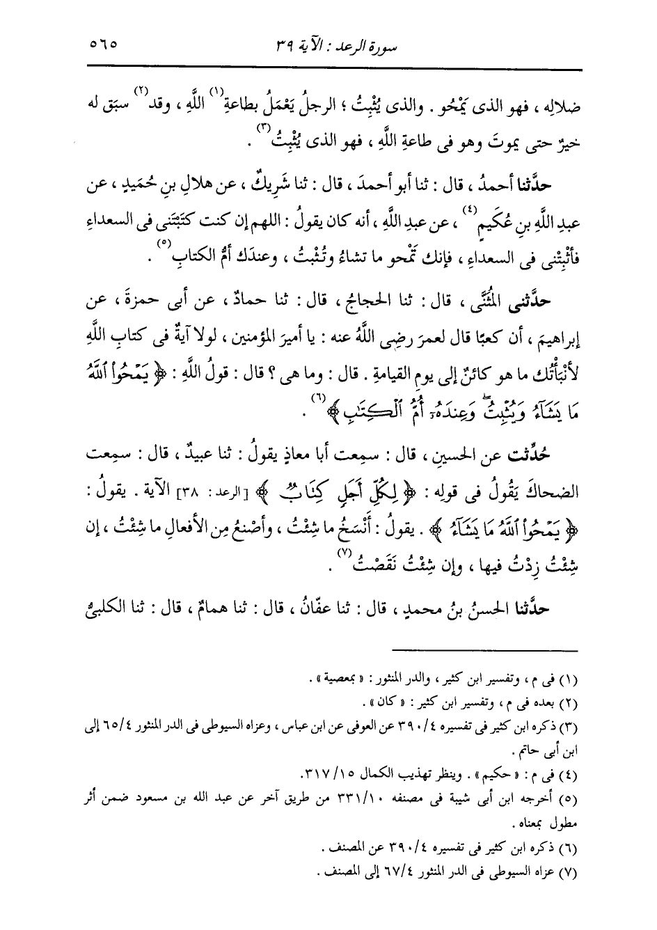 حَدَّثني الْمُثَنَّى، قَالَ: ثنا الْحَجَّاجُ، قَالَ: ثنا حَمَّادٌ، عَنْ أَبِي حَمْزَةَ، عَنْ إِبْرَاهِيمَ، أَنَّ كَعْبًا قَالَ لِعُمَرَ رَضِيَ اللَّهُ عَنْهُ: " يَا أَمِيرَ الْمُؤْمِنِينَ، §لَوْلَا آيَةٌ فِي كِتَابِ اللَّهِ لَأَنْبَأْتُكَ مَا هُوَ كَائِنٌ إِلَى يَوْمِ الْقِيَامَةِ، قَالَ: وَمَا هِيَ؟ قَالَ: قَوْلُ اللَّهِ: {يَمْحُو اللَّهُ مَا يَشَاءُ وَيُثْبِتُ، وَعِنْدَهُ أُمُّ الْكِتَابِ} [الرعد: 39] "