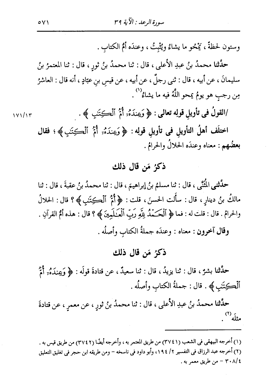 §الْقَوْلُ فِي تَأْوِيلِ قَوْلِهِ تَعَالَى: {وَعِنْدَهُ أُمُّ الْكِتَابِ} [الرعد: 39] اخْتَلَفَ أَهْلُ التَّأْوِيلِ فِي تَأْوِيلِ قَوْلِهِ: {وَعِنْدَهُ أُمُّ الْكِتَابِ} [الرعد: 39] فَقَالَ بَعْضُهُمْ: مَعْنَاهُ: وَعِنْدَهُ الْحَلَالُ وَالْحَرَامُ