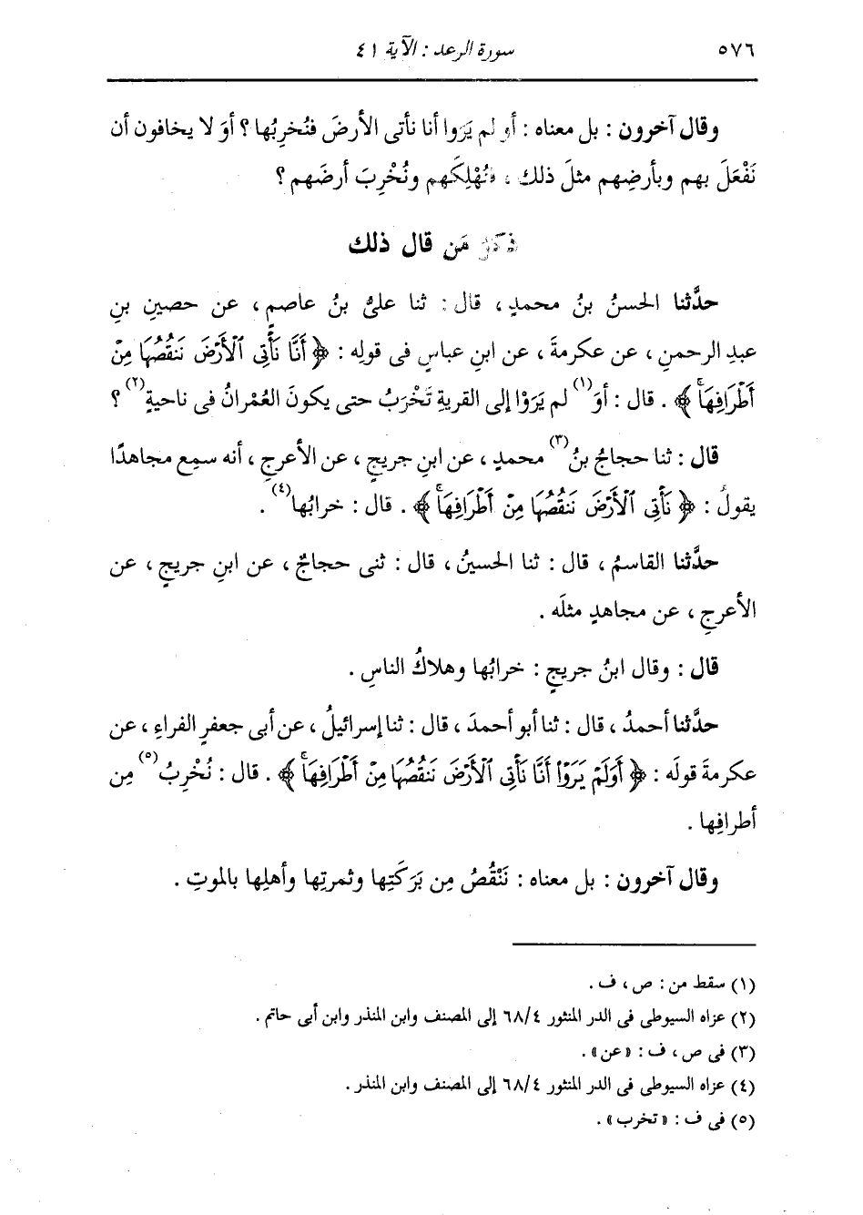 قَالَ: ثنا حَجَّاجُ بْنُ مُحَمَّدٍ، عَنِ ابْنِ جُرَيْجٍ، عَنِ الْأَعْرَجِ، أَنَّهُ سَمِعَ مُجَاهِدًا، يَقُولُ: {§نَأْتِي الْأَرْضَ نَنْقُصُهَا مِنْ أَطْرَافِهَا} [الرعد: 41] قَالَ: «خَرَابُهَا» . حَدَّثَنَا الْقَاسِمُ، قَالَ: ثنا الْحُسَيْنُ، قَالَ: ثني حَجَّاجٌ، عَنِ ابْنِ جُرَيْجٍ، عَنِ الْأَعْرَجِ، عَنْ مُجَاهِدٍ، مِثْلَهُ. قَالَ: وَقَالَ ابْنُ جُرَيْجٍ: خَرَابُهَا وَهَلَاكُ النَّاسِ