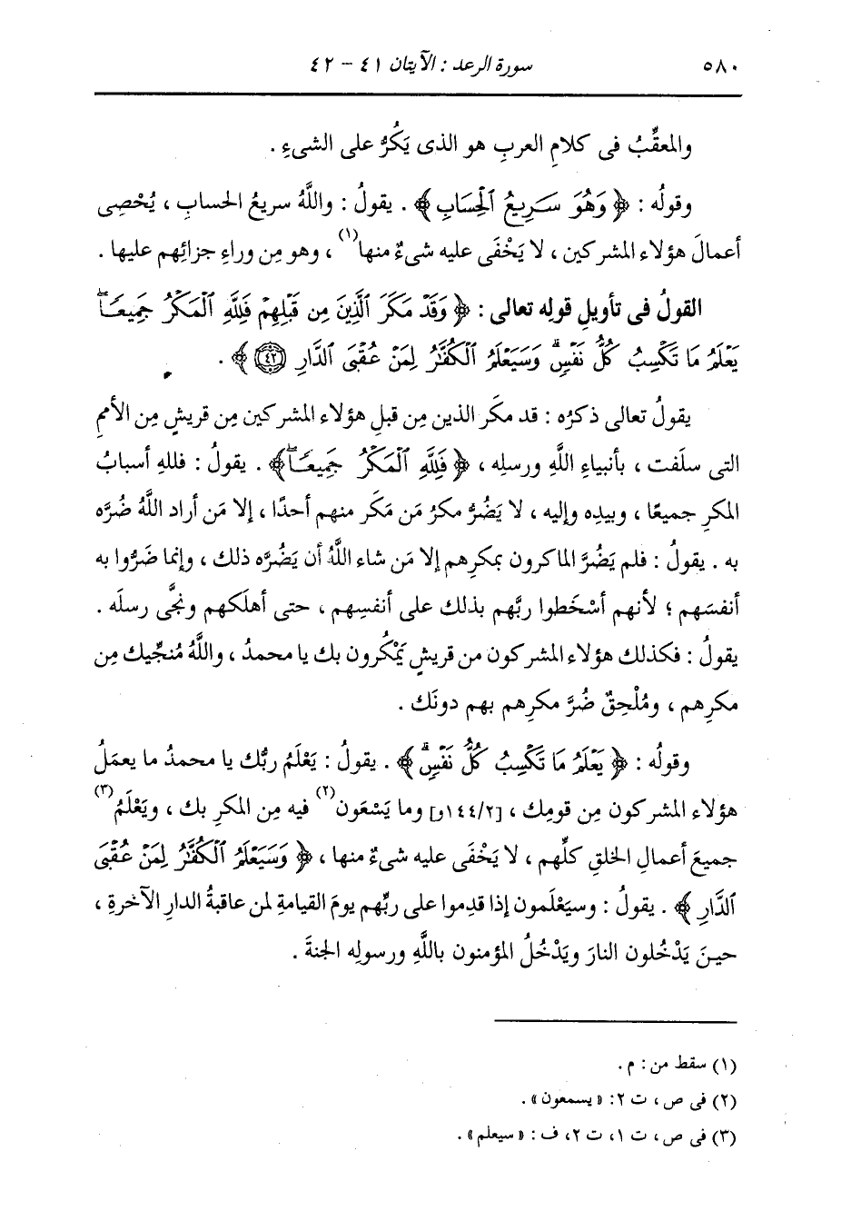 §وَقَوْلُهُ: {يَعْلَمُ مَا تَكْسِبُ كُلُّ نَفْسٍ} [الرعد: 42] يَقُولُ: يَعْلَمُ رَبُّكَ يَا مُحَمَّدُ مَا يَعْمَلُ هَؤُلَاءِ الْمُشْرِكُونَ مِنْ قَوْمِكَ، وَمَا يَسْعَوْنَ فِيهِ مِنَ الْمَكْرِ بِكَ، وَيَعْلَمُ جَمِيعَ أَعْمَالِ الْخَلْقِ كُلِّهِمْ، لَا يَخْفَى عَلَيْهِ شَيْءٌ مِنْهَا