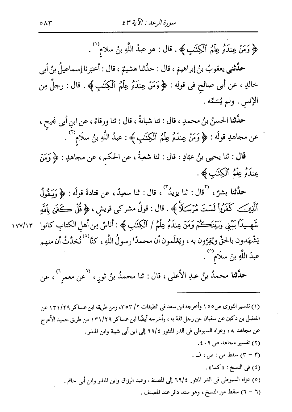 حَدَّثَنَا مُحَمَّدُ بْنُ عَبْدِ الْأَعْلَى، قَالَ: ثنا مُحَمَّدُ بْنُ ثَوْرٍ، عَنْ -[584]- قَتَادَةَ: {§وَمَنْ عِنْدَهُ عِلْمُ الْكِتَابِ} [الرعد: 43] قَالَ: «كَانَ مِنْهُمْ عَبْدُ اللَّهِ بْنُ سَلَامٍ، وَسَلْمَانُ الْفَارِسِيُّ، وَتَمِيمٌ الدَّارِيُّ»