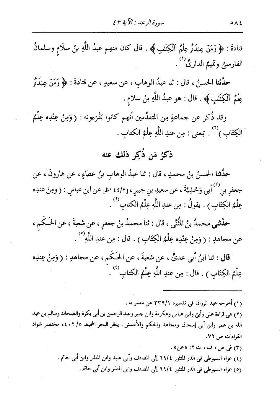 حَدَّثَنَا الْحَسَنُ، قَالَ: ثنا عَبْدُ الْوَهَّابِ، عَنْ سَعِيدٍ، عَنْ قَتَادَةَ: {§وَمَنْ عِنْدَهُ عِلْمُ الْكِتَابِ} [الرعد: 43] قَالَ: «هُوَ عَبْدُ اللَّهِ بْنُ سَلَامٍ» وَقَدْ ذُكِرَ عَنْ جَمَاعَةٍ مِنَ الْمُتَقَدِّمِينَ أَنَّهُمْ كَانُوا يَقْرَءُونَهُ: (وَمِنْ عِنْدِهِ عُلِمَ الْكِتَابُ) بِمَعْنَى: مِنْ عِنْدِ اللَّهِ عُلِمَ الْكِتَابُ. ذِكْرُ مَنْ ذُكِرَ ذَلِكَ عَنْهُ