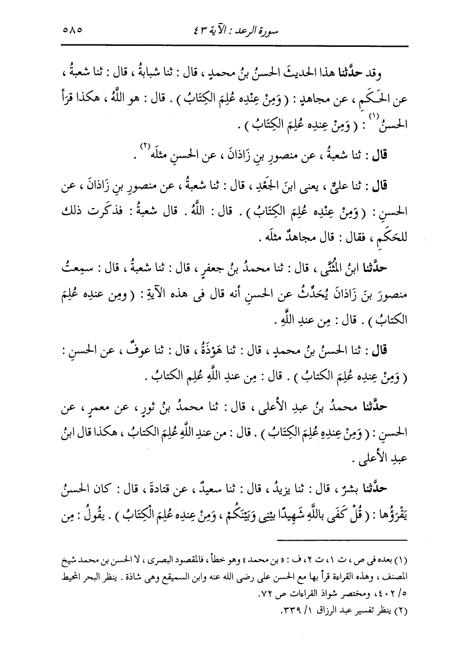 حَدَّثَنَا ابْنُ الْمُثَنَّى قَالَ: ثنا مُحَمَّدُ بْنُ جَعْفَرٍ، قَالَ: ثنا شُعْبَةُ قَالَ: سَمِعْتُ مَنْصُورَ بْنَ زَاذَانَ يُحَدِّثُ، عَنِ الْحَسَنِ أَنَّهُ قَالَ فِي هَذِهِ الْآيَةِ: «§وَمِنْ عِنْدِهِ عُلِمَ الْكِتَابُ» قَالَ: مِنْ عِنْدِ اللَّهِ "