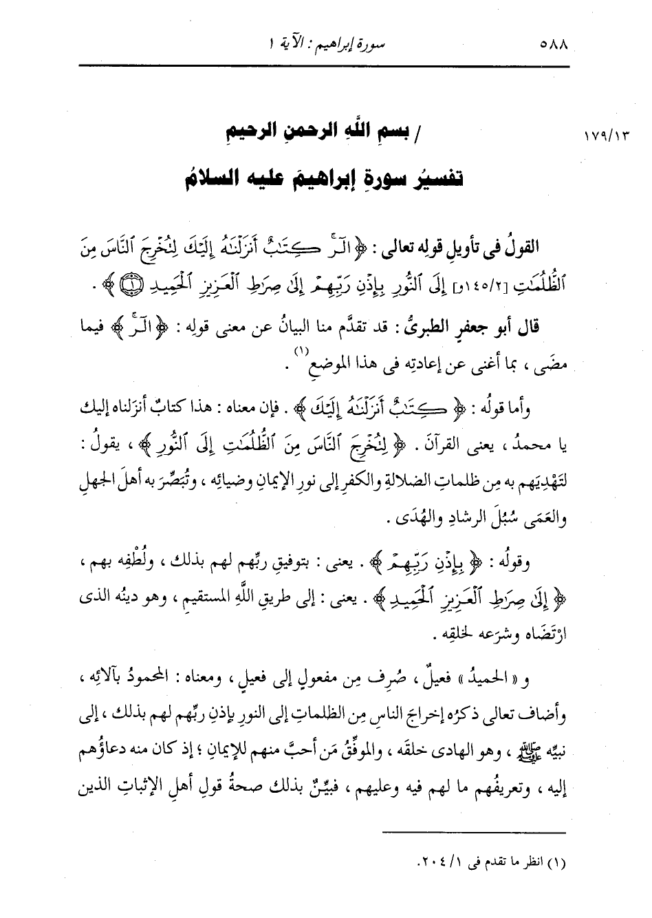 §الْقَوْلُ فِي تَأْوِيلِ قَوْلِهِ تَعَالَى: {الر. كِتَابٌ أَنْزَلْنَاهُ إِلَيْكَ لِتُخْرِجَ النَّاسَ مِنَ الظُّلُمَاتِ إِلَى النُّورِ بِإِذْنِ رَبِّهِمْ إِلَى صِرَاطِ الْعَزِيزِ الْحَمِيدِ} [إبراهيم: 1] قَالَ أَبُو جَعْفَرٍ الطَّبَرِيُّ: قَدْ تَقَدَّمَ مِنَّا الْبَيَانُ عَنْ مَعْنَى قَوْلِهِ: {الر} [يونس: 1] فِيمَا مَضَى بِمَا أَغْنَى عَنْ إِعَادَتِهِ فِي هَذَا الْمَوْضِعِ، أَمَّا قَوْلُهُ: {كِتَابٌ أَنْزَلْنَاهُ إِلَيْكَ} [إبراهيم: 1] فَإِنَّ مَعْنَاهُ: هَذَا كِتَابٌ أَنْزَلْنَاهُ إِلَيْكَ يَا مُحَمَّدُ، يَعْنِي الْقُرْآنَ {لِتُخْرِجَ النَّاسَ مِنَ الظُّلُمَاتِ إِلَى النُّورِ} [إبراهيم: 1] يَقُولُ: لِتَهْدِيهِمْ بِهِ مِنْ ظُلُمَاتِ الضَّلَالَةِ وَالْكُفْرِ إِلَى نُورِ الْإِيمَانِ وَضِيَائِهِ، وَتُبَصِّرُ بِهِ أَهْلَ الْجَهْلِ وَالْعَمَى سُبُلَ الرَّشَادِ وَالْهُدَى