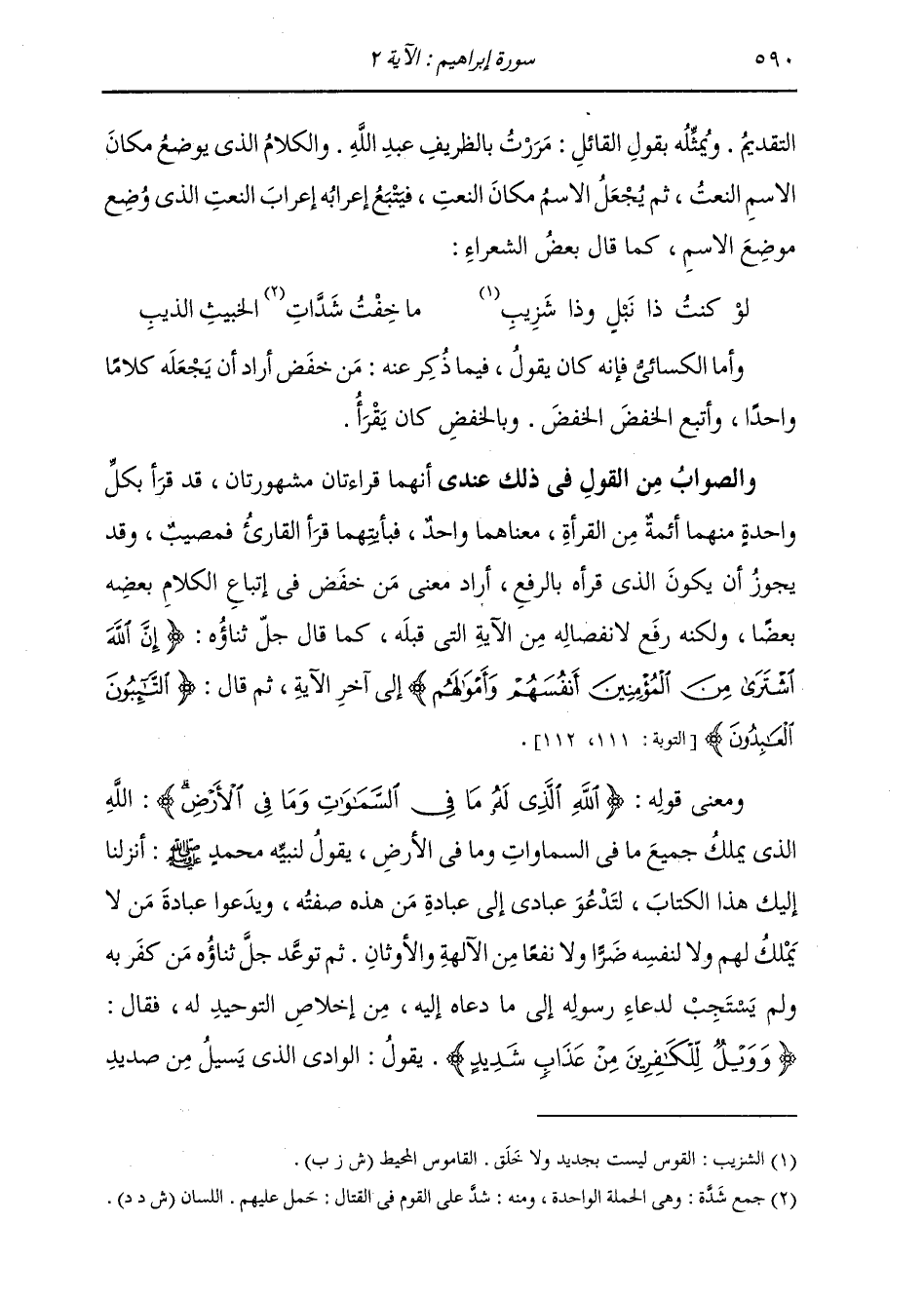 وَأَمَّا الْكَسَائِيُّ فَإِنَّهُ كَانَ يَقُولُ فِيمَا ذُكِرَ عَنْهُ: مَنْ خَفَضَ أَرَادَ أَنْ يَجْعَلَهُ كَلَامًا وَاحِدًا وَأَتْبَعَ الْخَفْضَ الْخَفْضَ، وَبِالْخَفْضِ كَانَ يَقْرَأُهُ. وَالصَّوَابُ مِنَ الْقَوْلِ فِي ذَلِكَ عِنْدِي، أَنَّهُمْ قِرَاءَتَانِ مَشْهُورَتَانِ قَدْ قَرَأَ بِكُلِّ وَاحِدَةٍ مِنْهُمَا أَئِمَّةٌ مِنَ الْقُرَّاءِ مَعْنَاهُمَا وَاحِدٌ، فَبِأَيَّتِهِمَا قَرَأَ الْقَارِئُ فَمُصِيبٌ، وَقَدْ يَجُوزُ أَنْ يَكُونَ الَّذِي قَرَأَهُ بِالرَّفْعِ، أَرَادَ مَعْنَى مَنْ خَفَضَ فِي إِتْبَاعِ الْكَلَامِ بَعْضُهُ بَعْضًا، وَلَكِنَّهُ رَفَعَ لِانْفِصَالِهِ مِنَ الْآيَةِ الَّتِي قَبْلَهُ، كَمَا قَالَ جَلَّ ثَنَاؤُهُ: {إِنَّ اللَّهَ اشْتَرَى مِنَ الْمُؤْمِنِينَ أَنْفُسَهُمْ وَأَمْوَالَهُمْ} [التوبة: 111] إِلَى آخِرِ الْآيَةِ، ثُمَّ قَالَ: {التَّائِبُونَ الْعَابِدُونَ} [التوبة: 112] وَمَعْنَى قَوْلِهِ: {اللَّهِ الَّذِي لَهُ مَا فِي السَّمَوَاتِ وَمَا فِي الْأَرْضِ} اللَّهُ الَّذِي يَمْلِكُ جَمِيعَ مَا فِي السَّمَوَاتِ وَمَا فِي الْأَرْضِ، يَقُولُ لِنَبِيِّهِ مُحَمَّدٍ صَلَّى اللهُ عَلَيْهِ وَسَلَّمَ: أَنْزَلْنَا إِلَيْكَ هَذَا الْكِتَابَ لِتَدْعُوَ عِبَادِي إِلَى عِبَادَةِ مَنْ هَذِهِ صِفَتُهُ، وَيَدَعُوا عِبَادَةَ مَنْ لَا يَمْلِكُ لَهُمْ وَلَا لِنَفْسِهِ ضَرًّا وَلَا نَفْعًا مِنَ الْآلِهَةِ وَالْأَوْثَانِ، ثُمَّ تَوَعَّدَ جَلَّ ثَنَاؤُهُ مَنْ كَفَرَ بِهِ وَلَمْ يَسْتَجِبْ لِدُعَاءِ رَسُولِهِ إِلَى مَا دَعَاهُ إِلَيْهِ مِنْ إِخْلَاصِ التَّوْحِيدِ لَهُ، فَقَالَ: {وَوَيْلٌ لِلْكَافِرِينَ مِنْ عَذَابٍ شَدِيدٍ} [إبراهيم: 2] يَقُولُ: الْوَادِي الَّذِي يَسِيلُ مِنْ صَدِيدِ