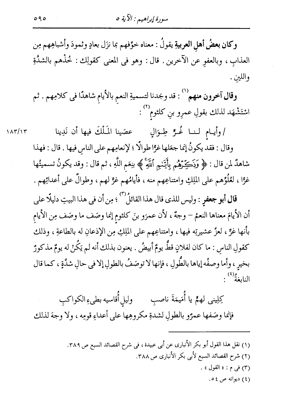 وَقَالَ: فَقَدْ يَكُونُ إِنَّمَا جَعَلَهَا غُرًّا طُوَالًا لِإِنْعَامِهِمْ عَلَى النَّاسِ فِيهَا. وَقَالَ: فَهَذَا شَاهِدٌ لِمَنْ قَالَ: {وَذَكِّرْهُمْ بِأَيَّامِ اللَّهِ} [إبراهيم: 5] بِنِعَمِ اللَّهِ ثُمَّ قَالَ: وَقَدْ يَكُونُ تَسْمِيَتُهَا غُرًّا، لِعُلُوِّهِمْ عَلَى الْمَلِكِ وَامْتِنَاعِهِمْ مِنْهُ، فَأَيَّامُهُمْ غُرٌّ لَهُمْ وَطُوَالٌ عَلَى أَعْدَائِهِمْ قَالَ أَبُو جَعْفَرٍ: وَلَيْسَ لِلَّذِي قَالَ هَذَا الْقَوْلَ، مِنْ أَنَّ فِي هَذَا الْبَيْتِ دَلِيلًا عَلَى أَنَّ الْأَيَّامَ مَعْنَاهَا النِّعَمُ وَجْهٌ، لِأَنَّ عَمْرَو بْنَ كُلْثُومٍ إِنَّمَا وَصَفَ مَا وَصَفَ مِنَ الْأَيَّامِ بِأَنَّهَا غُرٌّ، لِعِزِّ عَشِيرَتِهِ فِيهَا، وَامْتِنَاعِهِمْ عَلَى الْمَلِكِ مِنَ الْإِذْعَانِ لَهُ بِالطَّاعَةِ، وَذَلِكَ كَقَوْلِ النَّاسِ: مَا كَانَ لِفُلَانٍ قَطُّ يَوْمٌ أَبْيَضُ، يَعْنُونَ بِذَلِكَ: أَنَّهُ لَمْ يَكُنْ لَهُ يَوْمٌ مَذْكُورٌ بِخَيْرٍ، وَأَمَّا وَصْفُهُ إِيَّاهَا بِالطُّولِ، فَإِنَّهَا لَا تُوصَفُ بِالطُّولِ إِلَّا فِي حَالِ شِدَّةٍ، كَمَا قَالَ النَّابِغَةُ: