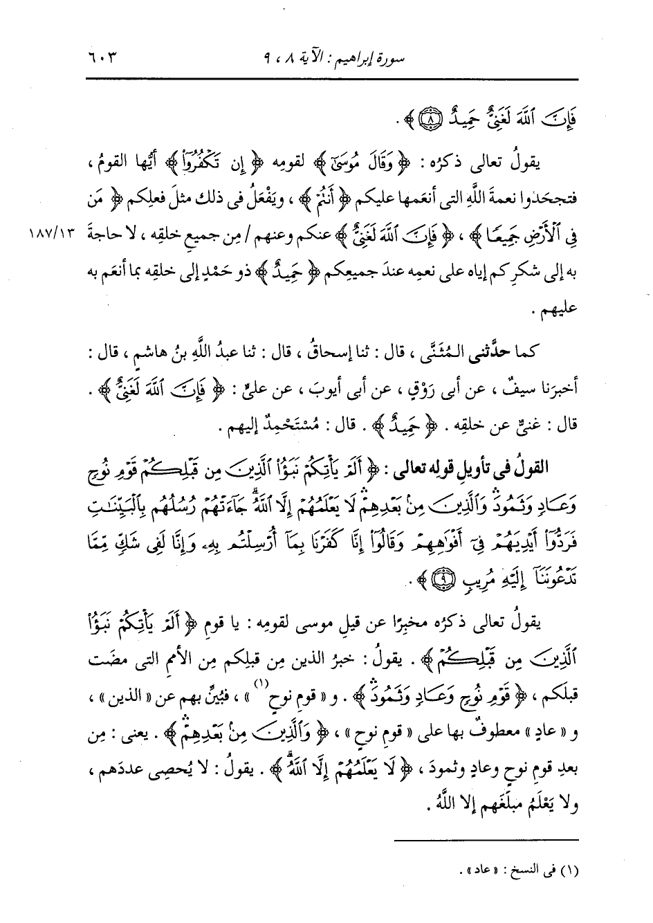 حَدَّثَنِي الْمُثَنَّى، قَالَ: ثنا إِسْحَاقُ، قَالَ: ثنا عَبْدُ اللَّهِ بْنُ هَاشِمٍ، قَالَ: أَخْبَرَنَا سَيْفٌ، عَنْ أَبِي رَوْقٍ، عَنْ أَبِي أَيُّوبَ، عَنْ عَلِيٍّ: {§فَإِنَّ اللَّهَ لَغَنِيُّ} [إبراهيم: 8] قَالَ: " غَنِيُّ عَنْ خَلْقِهِ، {حَمِيدٌ} [إبراهيم: 8] قَالَ: «مُسْتَحْمِدٌ إِلَيْهِمْ»