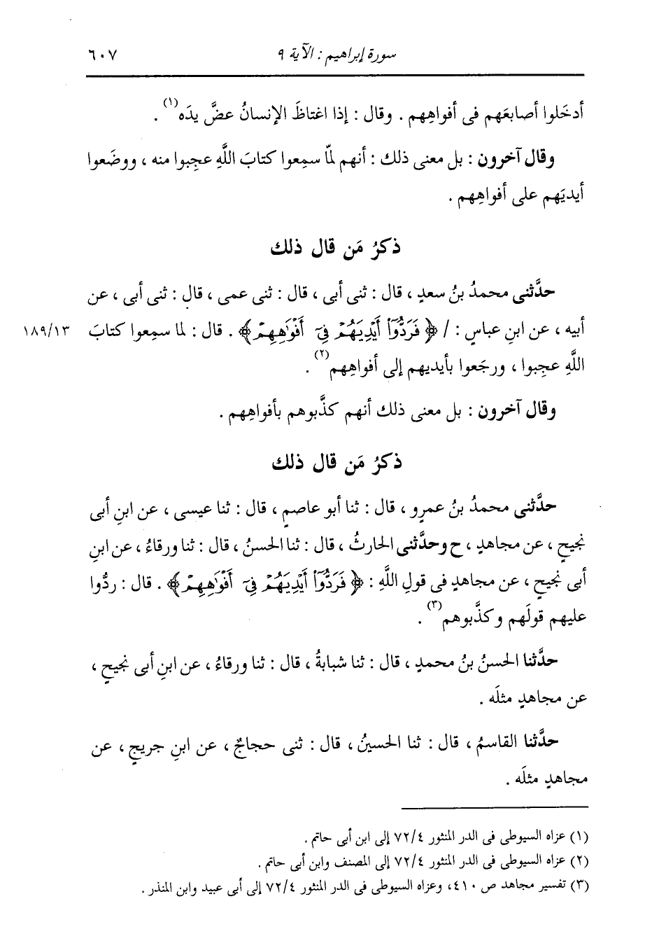 ذِكْرُ مَنْ قَالَ ذَلِكَ: حَدَّثَنِي مُحَمَّدُ بْنُ سَعْدٍ، قَالَ: ثني أَبِي قَالَ: ثني عَمِّي قَالَ: ثني أَبِي، عَنْ أَبِيهِ، عَنِ ابْنِ عَبَّاسٍ: {§فَرَدُّوا أَيْدِيَهُمْ فِي أَفْوَاهِهِمْ} [إبراهيم: 9] قَالَ: «لَمَّا سَمِعُوا كِتَابَ اللَّهِ عَجِبُوا، وَرَجَعُوا بِأَيْدِيهِمْ إِلَى أَفْوَاهِهِمْ» . وَقَالَ آخَرُونَ: بَلْ مَعْنَى ذَلِكَ أَنَّهُمْ كَذَّبُوهُمْ بِأَفْوَاهِهِمْ