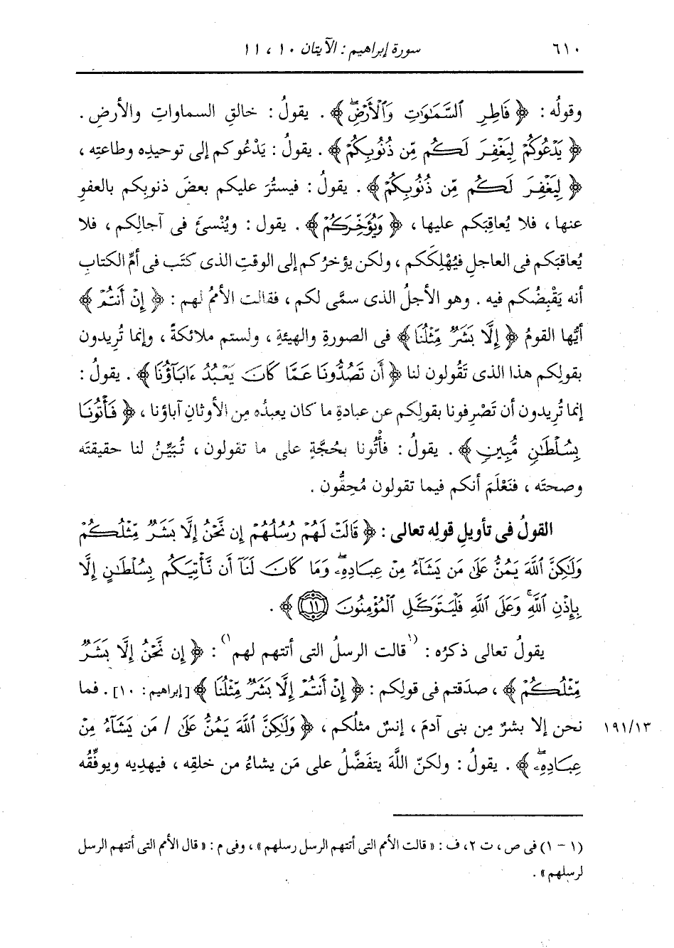 §الْقَوْلُ فِي تَأْوِيلِ قَوْلِهِ تَعَالَى: {قَالَتْ لَهُمْ رُسُلُهُمْ إِنْ نَحْنُ إِلَّا بَشَرٌ مِثْلُكُمْ، وَلَكِنَّ اللَّهَ يَمُنُّ عَلَى مَنْ يَشَاءُ مِنْ عِبَادِهِ، وَمَا كَانَ لَنَا أَنْ نَأْتِيَكُمْ بِسُلْطَانٍ إِلَّا بِإِذْنِ اللَّهِ، وَعَلَى اللَّهِ فَلْيَتَوَكَّلِ الْمُؤْمِنُونَ} [إبراهيم: 11] يَقُولُ تَعَالَى ذِكْرُهُ: قَالَ الْأُمَمُ الَّتِي أَتَتْهُمُ الرُّسُلُ لِرُسُلِهِمْ، {إِنْ نَحْنُ إِلَّا بَشَرٌ مِثْلُكُمْ} [إبراهيم: 11] صَدَقْتُمْ فِي قَوْلِكُمْ {إِنْ أَنْتُمْ إِلَّا بَشَرٌ مِثْلُنَا} [إبراهيم: 10] فَمَا نَحْنُ إِلَّا بَشَرٌ مِنْ بَنِي آدَمَ إِنْسٌ مِثْلُكُمْ، {وَلَكِنَّ اللَّهَ يَمُنُّ عَلَى مَنْ يَشَاءُ مِنْ عِبَادِهِ} [إبراهيم: 11] يَقُولُ: وَلَكِنَّ اللَّهَ يَتَفَضَّلُ عَلَى مَنْ يَشَاءُ مِنْ خَلْقِهِ، فَيَهْدِيهِ وَيُوَفِّقُهُ