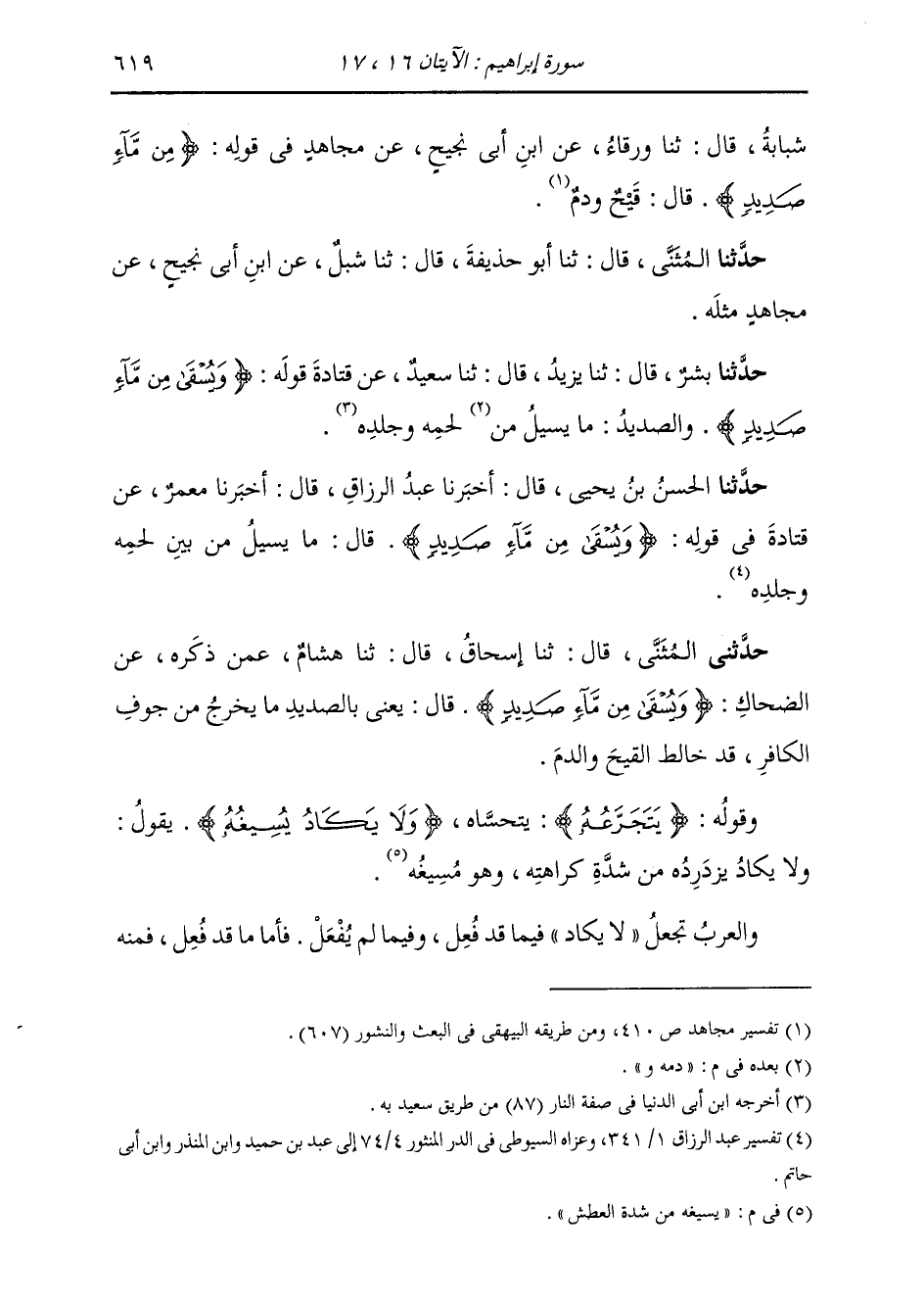 حَدَّثَنَا بِشْرٌ، قَالَ: ثنا يَزِيدُ، قَالَ: ثنا سَعِيدٌ، عَنْ قَتَادَةَ، قَوْلُهُ: {§وَيُسْقَى مِنْ مَاءٍ صَدِيدٍ} [إبراهيم: 16] " وَالصَّدِيدُ: مَا يَسِيلُ مِنْ دَمِهِ وَلَحْمِهِ وَجِلْدِهِ "