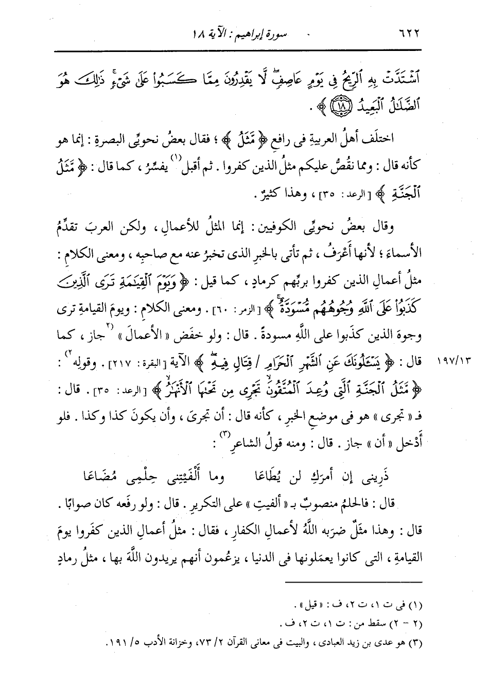 اشْتَدَّتْ بِهِ الرِّيحُ فِي يَوْمٍ عَاصِفٍ، لَا يَقْدِرُونَ مِمَّا كَسَبُوا عَلَى شَيْءٍ، ذَلِكَ هُوَ الضَّلَالُ الْبَعِيدُ} [إبراهيم: 18] اخْتَلَفَ أَهْلُ الْعَرَبِيَّةِ فِي رَافِعِ {مَثَلُ} [البقرة: 113] ، فَقَالَ بَعْضُ نَحْوِيِّي الْبَصْرَةِ: إِنَّمَا هُوَ كَأَنَّهُ قَالَ: وَمِمَّا نَقَصَ عَلَيْكَ {مَثَلُ الَّذِينَ كَفَرُوا} [إبراهيم: 18] ثُمَّ أَقْبَلَ يُفَسِّرُ كَمَا قَالَ: {مَثَلُ الْجَنَّةِ} [الرعد: 35] وَهَذَا كَثِيرٌ. وَقَالَ بَعْضُ نَحْوِيِّي الْكُوفِيِّينَ: إِنَّمَا الْمَثَلُ لِلْأَعْمَالِ، وَلَكِنَّ الْعَرَبَ تُقَدِّمُ الْأَسْمَاءَ لِأَنَّهَا أَعْرَفُ، ثُمَّ تَأْتِي بِالْخَبَرِ الَّذِي تُخْبِرُ عَنْهُ مَعَ صَاحِبِهِ، وَمَعْنَى الْكَلَامِ: مَثَلُ أَعْمَالِ الَّذِينَ كَفَرُوا بِرَبِّهِمْ كَرَمَادٍ، كَمَا قِيلَ: {وَيَوْمَ الْقِيَامَةِ تَرَى الَّذِينَ كَذَبُوا عَلَى اللَّهِ وُجُوهُهُمْ مُسْوَدَّةٌ} [الزمر: 60] وَمَعْنَى الْكَلَامِ: تَرَى يَوْمَ الْقِيَامَةِ وُجُوهَ الَّذِينَ كَذَبُوا عَلَى اللَّهِ مُسْوَدَّةً قَالَ: وَلَوْ خَفَضَ الْأَعْمَالَ جَازَ، كَمَا قَالَ: {يَسْأَلُونَكَ عَنِ الشَّهْرِ الْحَرَامِ قِتَالٍ فِيهِ} [البقرة: 217] الْآيَةَ وَقَوْلُهُ: {مَثَلُ الْجَنَّةِ الَّتِي وُعِدَ الْمُتَّقُونَ تَجْرِي مِنْ تَحْتِهَا الْأَنْهَارُ} [الرعد: 35] قَالَ: " فَتَجْرِي هُوَ فِي مَوْضِعِ الْخَبَرِ، كَأَنَّهُ قَالَ: أَنْ تَجْرِيَ، وَأَنْ يَكُونَ كَذَا وَكَذَا، فَلَوْ أَدْخَلَ «أَنَّ» جَازَ، قَالَ: وَمِنْهُ قَوْلُ الشَّاعِرِ: