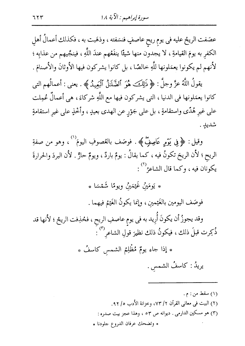 عَصَفَتِ الرِّيحُ عَلَيْهِ فِي يَوْمِ رِيحٍ عَاصِفٍ، فَنَسَفَتْهُ وَذَهَبَتْ بِهِ، فَكَذَلِكَ أَعْمَالُ أَهْلِ الْكُفْرِ بِهِ يَوْمَ الْقِيَامَةِ، لَا يَجِدُونَ مِنْهَا شَيْئًا يَنْفَعُهُمْ عِنْدَ اللَّهِ فَيُنْجِيهِمْ مِنْ عَذَابِهِ، لِأَنَّهُمْ لَمْ يَكُونُوا يَعْمَلُونَهَا للَّهِ خَالِصًا، بَلْ كَانُوا يُشْرِكُونَ فِيهَا الْأَوْثَانَ وَالْأَصْنَامَ. يَقُولُ اللَّهُ عَزَّ وَجَلَّ: {ذَلِكَ هُوَ الضَّلَالُ الْبَعِيدُ} [إبراهيم: 18] يَعْنِي أَعْمَالَهُمُ الَّتِي كَانُوا يَعْمَلُونَهَا فِي الدُّنْيَا الَّتِي يُشْرِكُونَ فِيهَا مَعَ اللَّهِ شُرَكَاءَ، هِيَ أَعْمَالٌ عُمِلَتْ عَلَى غَيْرِ هُدًى وَاسْتِقَامَةٍ، بَلْ عَلَى جَوْرٍ عَنِ الْهُدَى بَعِيدٍ، وَأَخْذٍ عَلَى غَيْرِ اسْتِقَامَةٍ شَدِيدٍ. وَقِيلَ: {فِي يَوْمٍ عَاصِفٍ} [إبراهيم: 18] فَوُصِفَ بِالْعُصُوفِ، وَهُوَ مِنْ صِفَةِ الرِّيحِ، لِأَنَّ الرِّيحَ تَكُونُ فِيهِ كَمَا يُقَالُ: يَوْمٌ بَارِدٌ، وَيَوْمٌ حَارٌّ، لِأَنَّ الْبَرْدَ وَالْحَرَارَةَ يَكُونَانِ فِيهِ؛ وَكَمَا قَالَ الشَّاعِرُ: