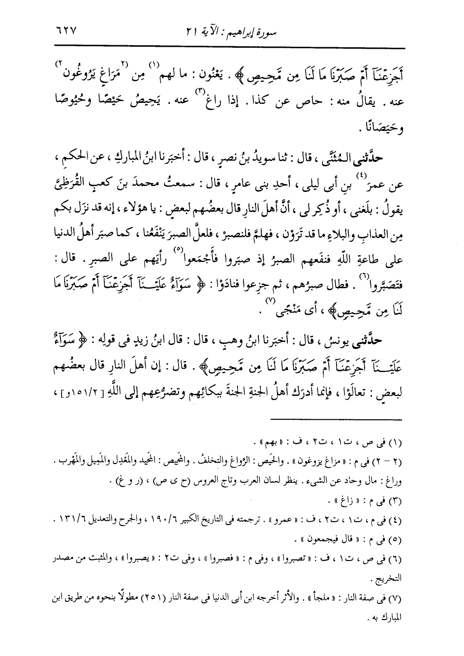 حَدَّثَنِي الْمُثَنَّى، قَالَ: ثنا سُوَيْدُ بْنُ نَصْرٍ، قَالَ: أَخْبَرَنَا ابْنُ الْمُبَارَكِ، عَنِ الْحَكَمِ، عَنْ عُمَرَ بْنِ أَبِي لَيْلَى، أَحَدِ بَنِي عَامِرٍ، قَالَ: سَمِعْتُ مُحَمَّدَ بْنَ كَعْبٍ الْقُرَظِيَّ، يَقُولُ: «بَلَغَنِي أَوْ ذُكِرَ لِي أَنَّ» §أَهْلَ النَّارِ قَالَ بَعْضُهُمْ لِبَعْضٍ: يَا هَؤُلَاءِ، إِنَّهُ قَدْ نَزَلَ بِكُمْ مِنَ الْعَذَابِ وَالْبَلَاءِ مَا قَدْ تَرَوْنَ، فَهَلُمَّ فَلْنَصْبِرْ، فَلَعَلَّ الصَّبْرَ يَنْفَعُنَا كَمَا صَبَرَ أَهْلُ الدُّنْيَا عَلَى طَاعَةِ اللَّهِ فَنَفَعَهُمُ الصَّبْرُ إِذْ صَبَرُوا قَالَ: فَيُجْمِعُونَ رَأْيَهُمْ عَلَى الصَّبْرِ، قَالَ: فَصَبَرُوا فَطَالَ صَبْرُهُمْ، ثُمَّ جَزَعُوا فَنَادَوْا: {سَوَاءٌ عَلَيْنَا أَجَزِعْنَا أَمْ صَبَرْنَا مَا لَنَا مِنْ مَحِيصِ} [إبراهيم: 21] أَيْ مَنْجًى "