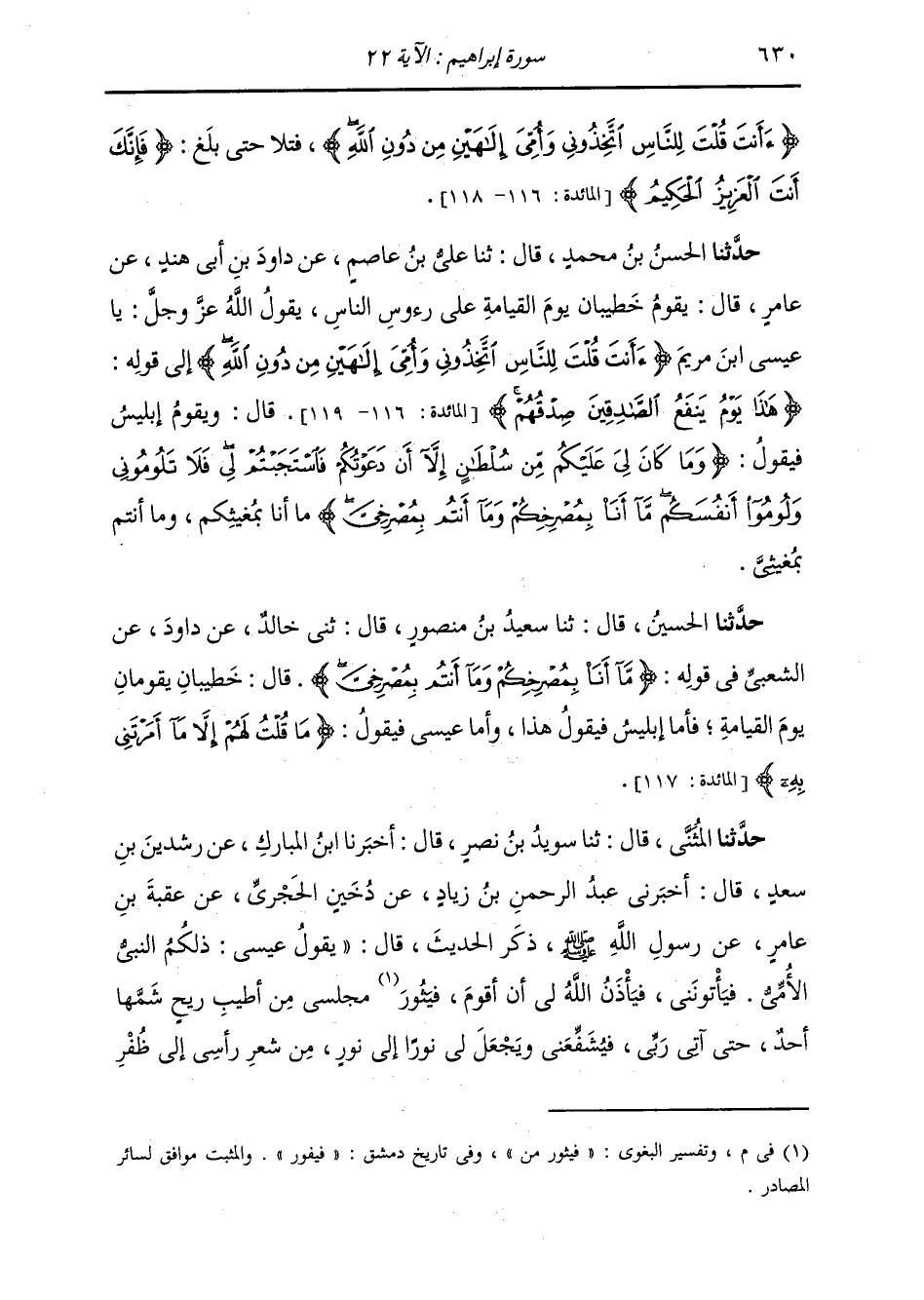 حَدَّثَنَا الْحُسَيْنُ قَالَ: ثنا سَعِيدُ بْنُ مَنْصُورٍ قَالَ: ثني خَالِدٌ، عَنْ دَاوُدَ، عَنِ الشَّعْبِيِّ فِي قَوْلِهِ: {§مَا أنا بِمُصْرِخِكُمْ وَمَا أَنْتُمْ بِمُصْرِخِيَّ} [إبراهيم: 22] قَالَ: " خَطِيبَانِ يَقُومَانِ يَوْمَ الْقِيَامَةِ، فَأَمَّا إِبْلِيسُ فَيَقُولُ هَذَا، وَأَمَا عِيسَى فَيَقُولُ: {مَا قُلْتُ لَهُمْ إِلَّا مَا أَمَرْتَنِي بِهِ} [المائدة: 117] "
