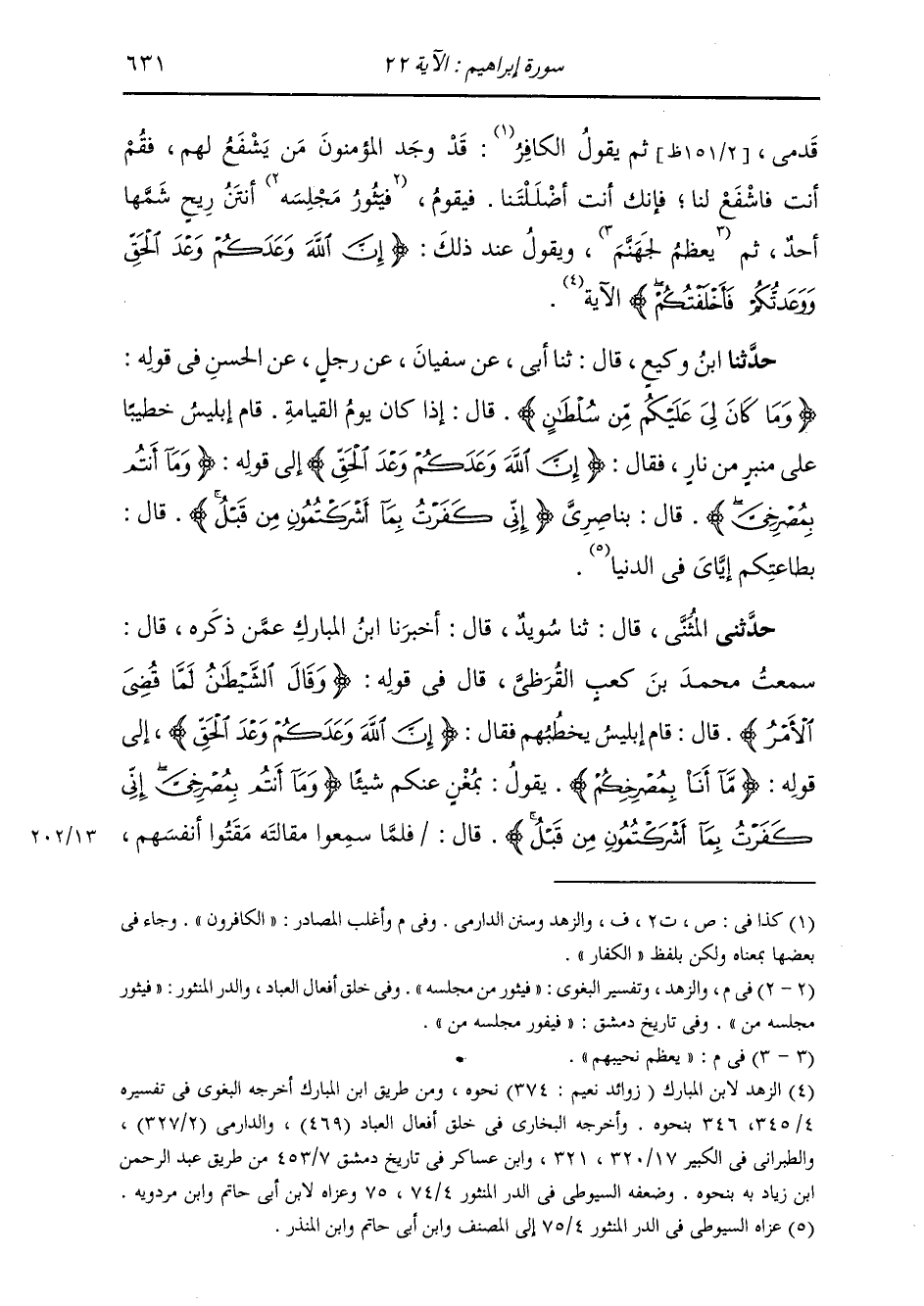 حَدَّثَنِي الْمُثَنَّى، قَالَ: ثنا سُوَيْدٌ، قَالَ: أَخْبَرَنَا ابْنُ الْمُبَارَكِ، عَمَّنْ ذَكَرَهُ قَالَ: سَمِعْتُ مُحَمَّدَ بْنَ كَعْبٍ الْقُرَظِيَّ، قَالَ فِي قَوْلِهِ: {§وَقَالَ الشَّيْطَانُ لَمَّا قُضِيَ الْأَمْرُ إِنَّ اللَّهَ وَعَدَكُمْ وَعْدَ الْحَقِّ} [إبراهيم: 22] قَالَ: " قَامَ إِبْلِيسُ يَخْطُبُهُمْ فَقَالَ: {إِنَّ اللَّهَ وَعَدَكُمْ وَعْدَ الْحَقِّ} [إبراهيم: 22] إِلَى قَوْلِهِ: {مَا أنا بِمُصْرِخِكُمْ} [إبراهيم: 22] يَقُولُ: بِمُغْنٍ عَنْكُمْ شَيْئًا، {وَمَا أَنْتُمْ بِمُصْرِخِيَّ إِنِّي كَفَرْتُ بِمَا أَشْرَكْتُمُونِ مِنْ قَبْلُ} [إبراهيم: 22] قَالَ: " فَلَمَّا سَمِعُوا مَقَالَتَهُ مَقَتُوا أَنْفُسَهُمْ، -[632]- قَالَا: فَنُودُوا: {لَمَقْتُ اللَّهِ أَكْبَرُ مِنْ مَقْتِكُمْ أَنْفُسَكُمْ} [غافر: 10] الْآيَةَ "