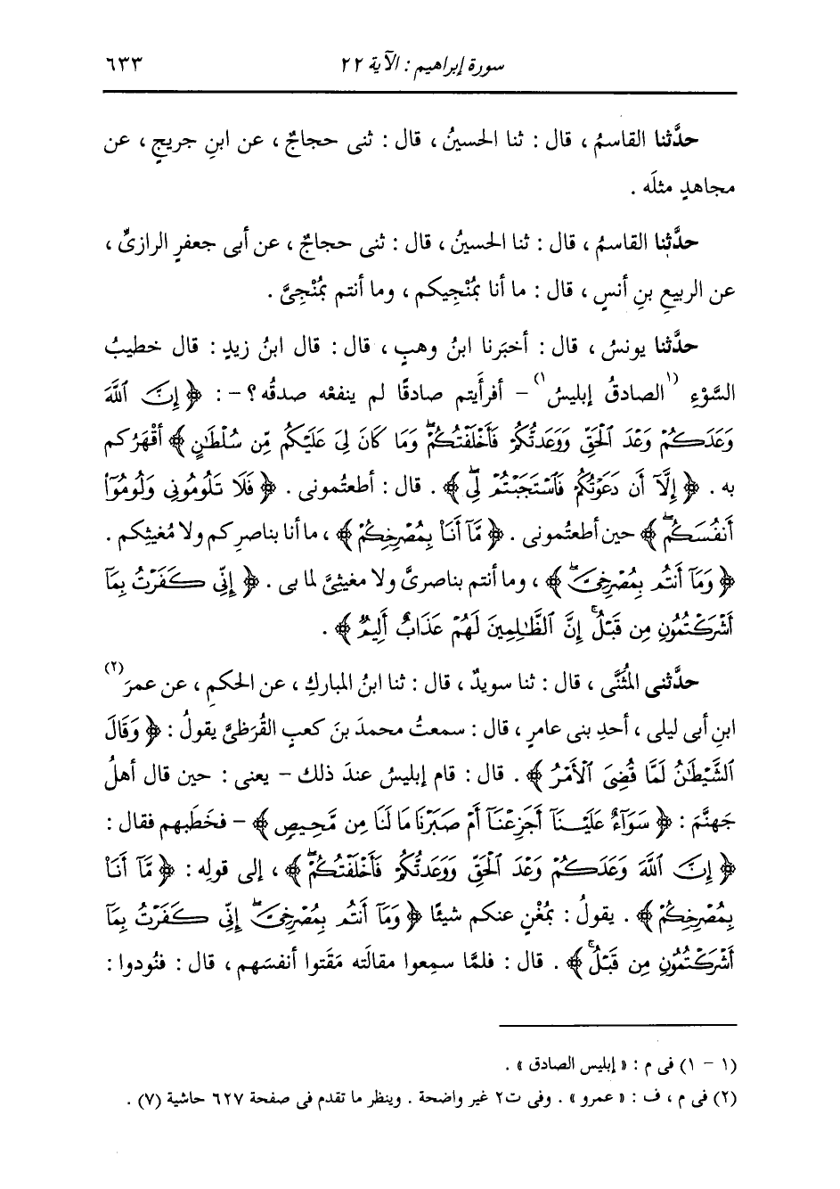 حَدَّثَنِي الْمُثَنَّى، قَالَ: ثنا سُوَيْدٌ، قَالَ: ثنا ابْنُ الْمُبَارَكِ، عَنِ الْحَكَمِ، عَنْ عَمْرِو بْنِ أَبِي لَيْلَى أَحَدِ بَنِي عَامِرٍ قَالَ: سَمِعْتُ مُحَمَّدَ بْنَ كَعْبٍ الْقُرَظِيَّ، يَقُولُ: {§وَقَالَ الشَّيْطَانُ لَمَّا قُضِيَ الْأَمْرُ} [إبراهيم: 22] قَالَ: " قَامَ إِبْلِيسُ عِنْدَ ذَلِكَ، يَعْنِي حِينَ قَالَ أَهْلُ جَهَنَّمَ: {سَوَاءٌ عَلَيْنَا أَجَزِعْنَا أَمْ صَبَرْنَا مَا لَنَا مِنْ مَحِيصِ} [إبراهيم: 21] فَخَطَبَ فَقَالَ: {إِنَّ اللَّهَ وَعَدَكُمْ وَعْدَ الْحَقِّ، وَوَعَدْتُكُمْ فَأَخْلَفْتُكُمْ} [إبراهيم: 22] إِلَى قَوْلِهِ: {مَا أنا بِمُصْرِخِكُمْ} [إبراهيم: 22] يَقُولُ: بِمُغْنٍ عَنْكُمْ شَيْئًا، {وَمَا أَنْتُمْ بِمُصْرِخِيَّ، إِنِّي كَفَرْتُ بِمَا أَشْرَكْتُمُونِ مِنْ قَبْلُ} [إبراهيم: 22] قَالَ: " فَلَمَّا سَمِعُوا مَقَالَتَهُ مَقَتُوا أَنْفُسَهُمْ، قَالَ: فَنُودُوا -[634]-: {لَمَقْتُ اللَّهِ أَكْبَرُ مِنْ مَقْتِكُمْ} [غافر: 10] "