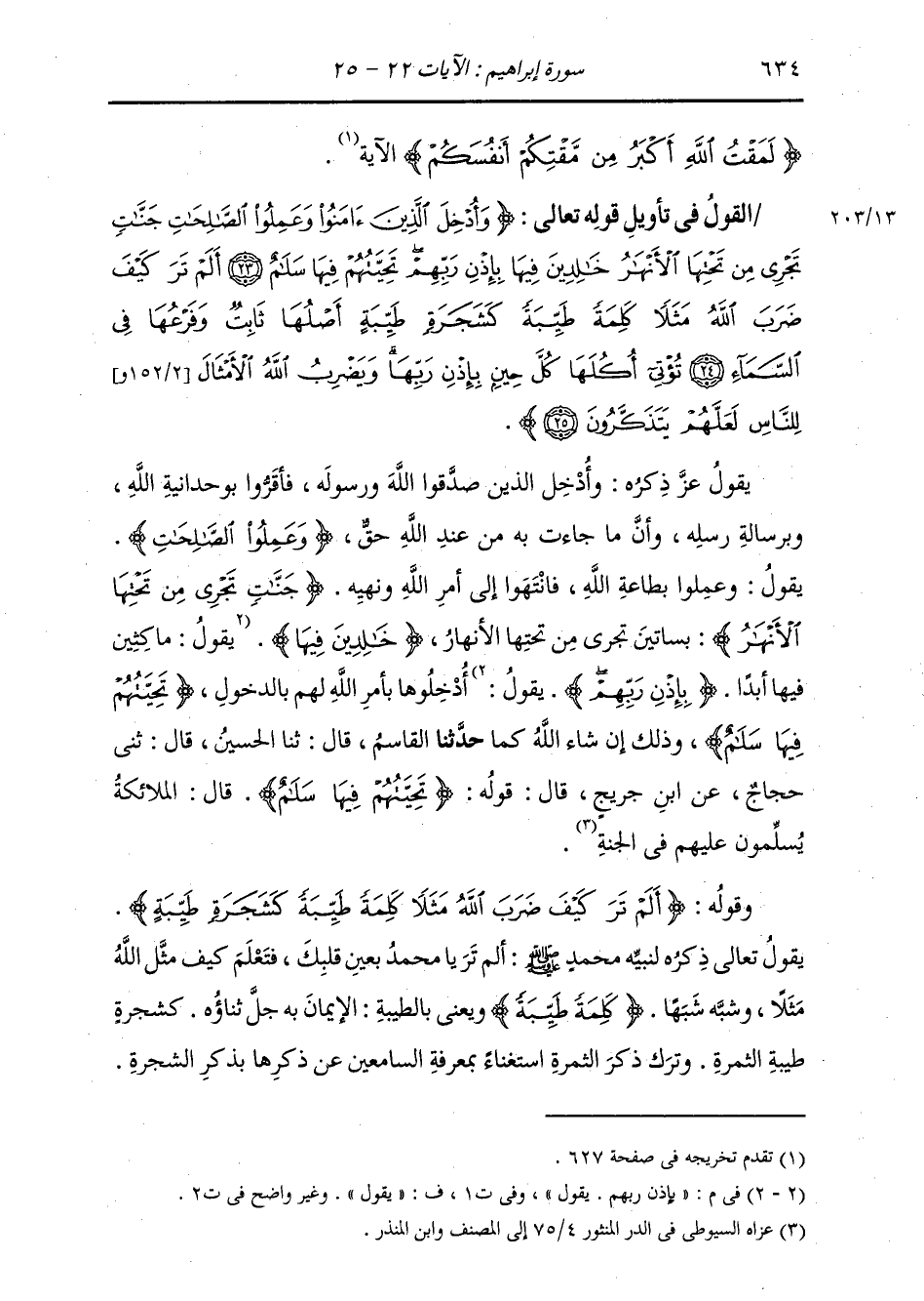 §الْقَوْلُ فِي تَأْوِيلِ قَوْلِهِ تَعَالَى: {وَأُدْخِلَ الَّذِينَ آمَنُوا وَعَمِلُوا الصَّالِحَاتِ جَنَّاتٍ تَجْرِي مِنْ تَحْتِهَا الْأَنْهَارُ، خَالِدِينَ فِيهَا بِإِذْنِ رَبِّهِمْ، تَحِيَّتُهُمْ فِيهَا سَلَامٌ. أَلَمْ تَرَ كَيْفَ ضَرَبَ اللَّهُ مَثَلًا كَلِمَةً طَيِّبَةً كَشَجَرَةٍ طَيِّبَةٍ أَصْلُهَا ثَابِتٌ وَفَرْعُهَا فِي السَّمَاءِ. تُؤْتِي أُكُلَهَا كُلَّ حِينٍ بِإِذْنِ رَبِّهَا، وَيَضْرِبُ اللَّهُ الْأَمْثَالَ لِلنَّاسِ لَعَلَّهُمْ يَتَذَكَّرُونَ} [إبراهيم: 24] يَقُولُ عَزَّ ذِكْرُهُ: وَأُدْخِلَ الَّذِينَ صَدَقُوا اللَّهَ وَرَسُولَهُ فَأَقَرُّوا بِوَحْدَانِيَّةِ اللَّهِ وَبِرِسَالَةِ رُسُلِهِ وَأَنَّ مَا جَاءَتْ بِهِ مِنْ عِنْدِ اللَّهِ حَقٌّ، {وَعَمِلُوا الصَّالِحَاتِ} [البقرة: 25] يَقُولُ: وَعَمِلُوا بِطَاعَةِ اللَّهِ فَانْتَهُوا إِلَى أَمْرِ اللَّهِ وَنَهْيِهِ، {جَنَّاتٍ تَجْرِي مِنْ تَحْتِهَا الْأَنْهَارُ} [البقرة: 25] بَسَاتِينَ تَجْرِي مِنْ تَحْتِهَا الْأَنْهَارُ، {خَالِدِينَ فِيهَا بِإِذْنِ رَبِّهِمْ} [إبراهيم: 23] يَقُولُ: ادْخُلُوهَا بِأَمْرِ اللَّهِ لَهُمْ بِالدُّخُولِ {تَحِيَّتُهُمْ فِيهَا سَلَامٌ} [إبراهيم: 23] وَذَلِكَ إِنْ شَاءَ اللَّهُ، كَمَا