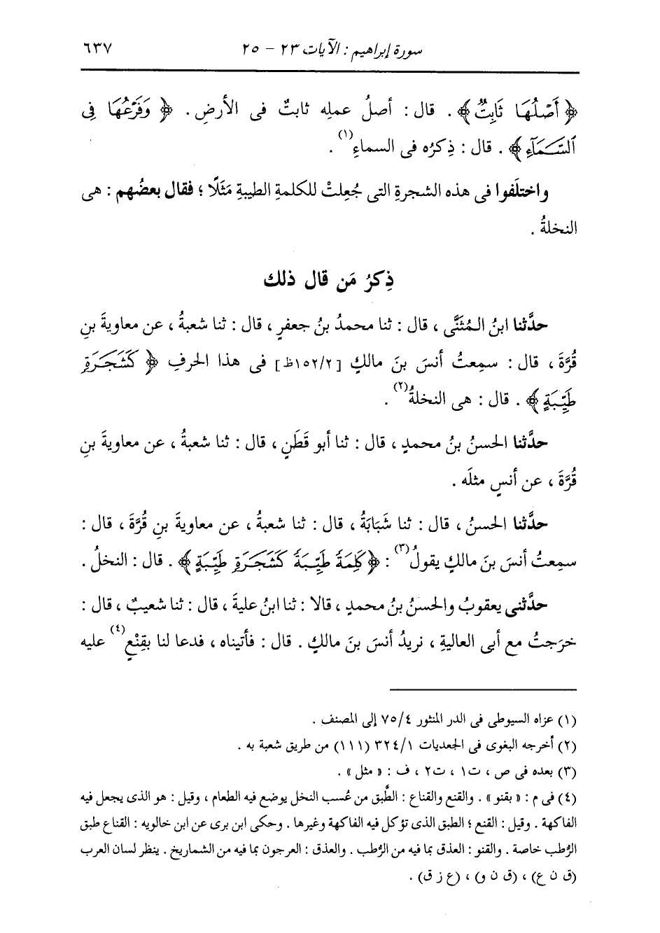 ذِكْرُ مَنْ قَالَ ذَلِكَ: حَدَّثَنَا ابْنُ الْمُثَنَّى، قَالَ: ثنا مُحَمَّدُ بْنُ جَعْفَرٍ، قَالَ: ثنا شُعْبَةُ، عَنْ مُعَاوِيَةَ بْنِ قُرَّةَ، قَالَ: سَمِعْتُ أَنَسَ بْنَ مَالِكٍ، فِي هَذَا الْحَرْفِ: {§كَشَجَرَةٍ طَيِّبَةٍ} [إبراهيم: 24] قَالَ: «هِيَ النَّخْلَةُ» . حَدَّثَنَا الْحَسَنُ بْنُ مُحَمَّدٍ قَالَ: ثنا أَبُو قَطَنٍ قَالَ: ثنا شُعْبَةُ، عَنْ مُعَاوِيَةَ بْنِ قُرَّةَ، عَنْ أَنَسٍ، مِثْلَهُ