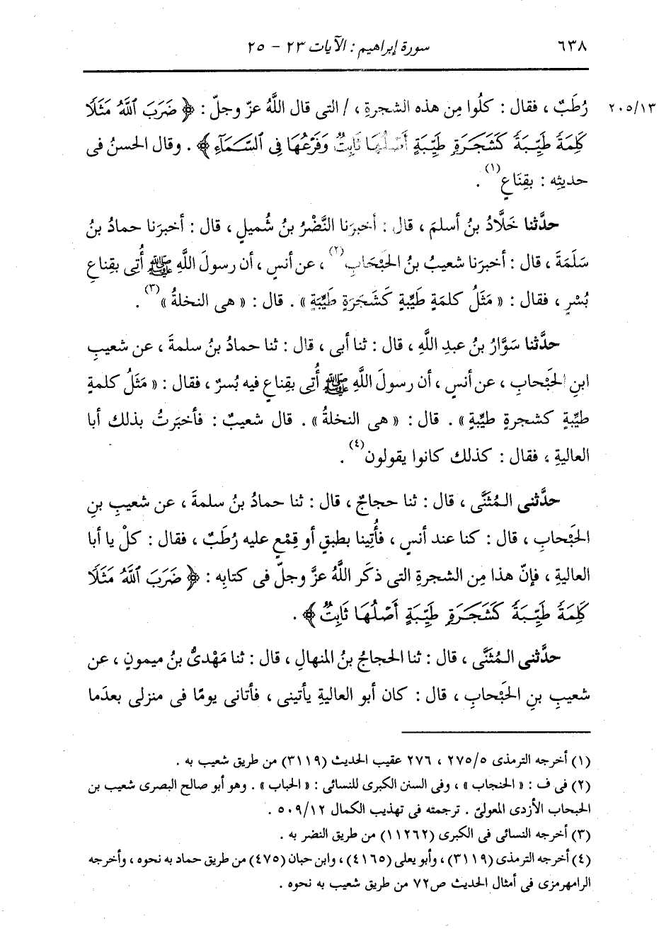 حَدَّثَنِي الْمُثَنَّى، قَالَ: ثنا حَجَّاجٌ، قَالَ: ثنا حَمَّادُ بْنُ سَلَمَةَ، عَنْ شُعَيْبِ بْنِ الْحَبْحَابِ، قَالَ: كُنَّا عِنْدَ أَنَسٍ، فَأُتِينَا بِطَبَقٍ أَوْ قُنْعٍ عَلَيْهِ رُطَبٍ، فَقَالَ: كُلْ يَا أَبَا الْعَالِيَةِ، فَإِنَّ §هَذَا مِنَ الشَّجَرَةِ الَّتِي ذَكَرَ اللَّهُ عَزَّ وَجَلَّ فِي كِتَابِهِ {ضَرَبَ اللَّهُ مَثَلًا كَلِمَةً طَيِّبَةً كَشَجَرَةٍ طَيِّبَةٍ، أَصْلُهَا ثَابِتٌ} [إبراهيم: 24] "