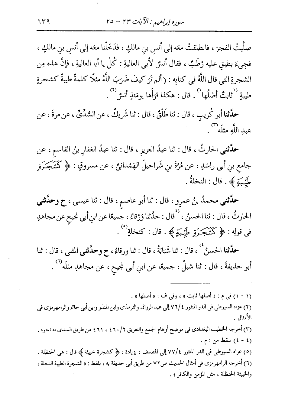 حَدَّثَنِي الْحَارِثُ، قَالَ ثنا عَبْدُ الْعَزِيزِ، قَالَ: ثنا عَبْدُ الْغَفَّارِ بْنُ الْقَاسِمِ، عَنْ جَامِعِ بْنِ أَبِي رَاشِدٍ، عَنْ مُرَّةَ بْنِ شَرَاحِيلَ الْهَمْدَانِيِّ، عَنْ مَسْرُوقٍ: {§كَشَجَرَةٍ طَيِّبَةٍ} [إبراهيم: 24] قَالَ: «النَّخْلَةُ» . حَدَّثَنِي مُحَمَّدُ بْنُ عَمْرٍو، قَالَ: ثنا أَبُو عَاصِمٍ، قَالَ: ثنا عِيسَى، ح وَحَدَّثَنِي الْحَارِثُ، قَالَ: ثنا الْحَسَنُ، قَالَ: ثنا شَبَابَةُ، قَالَ: ثنا وَرْقَاءُ، ح. وَحَدَّثَنِي الْمُثَنَّى، قَالَ: ثنا أَبُو حُذَيْفَةَ، قَالَ: ثنا شِبْلٌ، جَمِيعًا، عَنِ ابْنِ أَبِي نَجِيحٍ، عَنْ مُجَاهِدٍ، مِثْلَهُ. -[640]- حَدَّثَنَا أَحْمَدُ، قَالَ: ثنا أَبُو أَحْمَدَ، قَالَ: ثنا إِسْرَائِيلُ، عَنِ السُّدِّيِّ، عَنْ مُرَّةَ، عَنْ عَبْدِ اللَّهِ، مِثْلَهُ