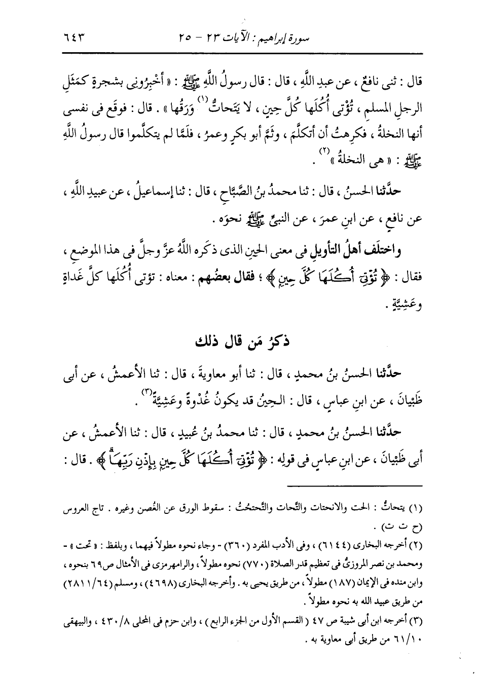 حَدَّثَنَا الْحَسَنُ بْنُ مُحَمَّدٍ قَالَ: ثنا مُحَمَّدُ بْنُ عُبَيْدٍ قَالَ: ثنا الْأَعْمَشُ، عَنْ أَبِي ظَبْيَانَ، عَنِ ابْنِ عَبَّاسٍ فِي قَوْلِهِ: {§تُؤْتِي أُكُلَهَا كُلَّ حِينٍ بِإِذْنِ رَبِّهَا} [إبراهيم: 25] قَالَ: «-[644]- غُدْوَةً وَعَشِيَّةً» . حَدَّثَنَا ابْنُ بَشَّارٍ قَالَ: ثنا يَحْيَى قَالَ: ثنا سُفْيَانُ، عَنِ الْأَعْمَشِ، عَنْ أَبِي ظَبْيَانَ، عَنِ ابْنِ عَبَّاسٍ، مِثْلَهُ. حَدَّثَنَا مُحَمَّدُ بْنُ الْمُثَنَّى قَالَ: ثنا مُحَمَّدُ بْنُ أَبِي عَدِيٍّ، عَنْ شُعْبَةَ، عَنْ سُلَيْمَانَ، عَنْ أَبِي ظَبْيَانَ، عَنِ ابْنِ عَبَّاسٍ، بِمِثْلِهِ. حَدَّثَنَا أَبُو كُرَيْبٍ قَالَ: ثنا طَلْقٌ، عَنْ زَائِدَةَ، عَنِ الْأَعْمَشِ، عَنْ أَبِي ظَبْيَانَ، عَنِ ابْنِ عَبَّاسِ مِثْلَهُ