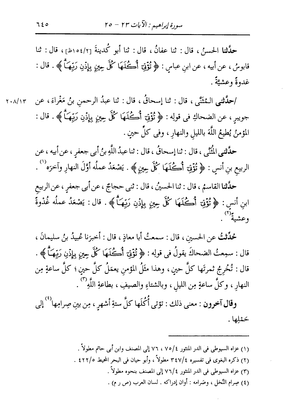 حَدَّثَنِي الْمُثَنَّى، قَالَ: ثنا إِسْحَاقُ، قَالَ: ثنا عَبْدُ الرَّحْمَنِ بْنُ مَغْرَاءَ، عَنْ جُوَيْبِرٍ، عَنِ الضَّحَّاكِ، فِي قَوْلِهِ: {§تُؤْتِي أُكُلَهَا كُلَّ حِينٍ بِإِذْنِ رَبِّهَا} [إبراهيم: 25] قَالَ: «الْمُؤْمِنُ يُطِيعُ اللَّهَ بِاللَّيْلِ وَالنَّهَارِ، وَفِي كُلِّ حِينٍ»