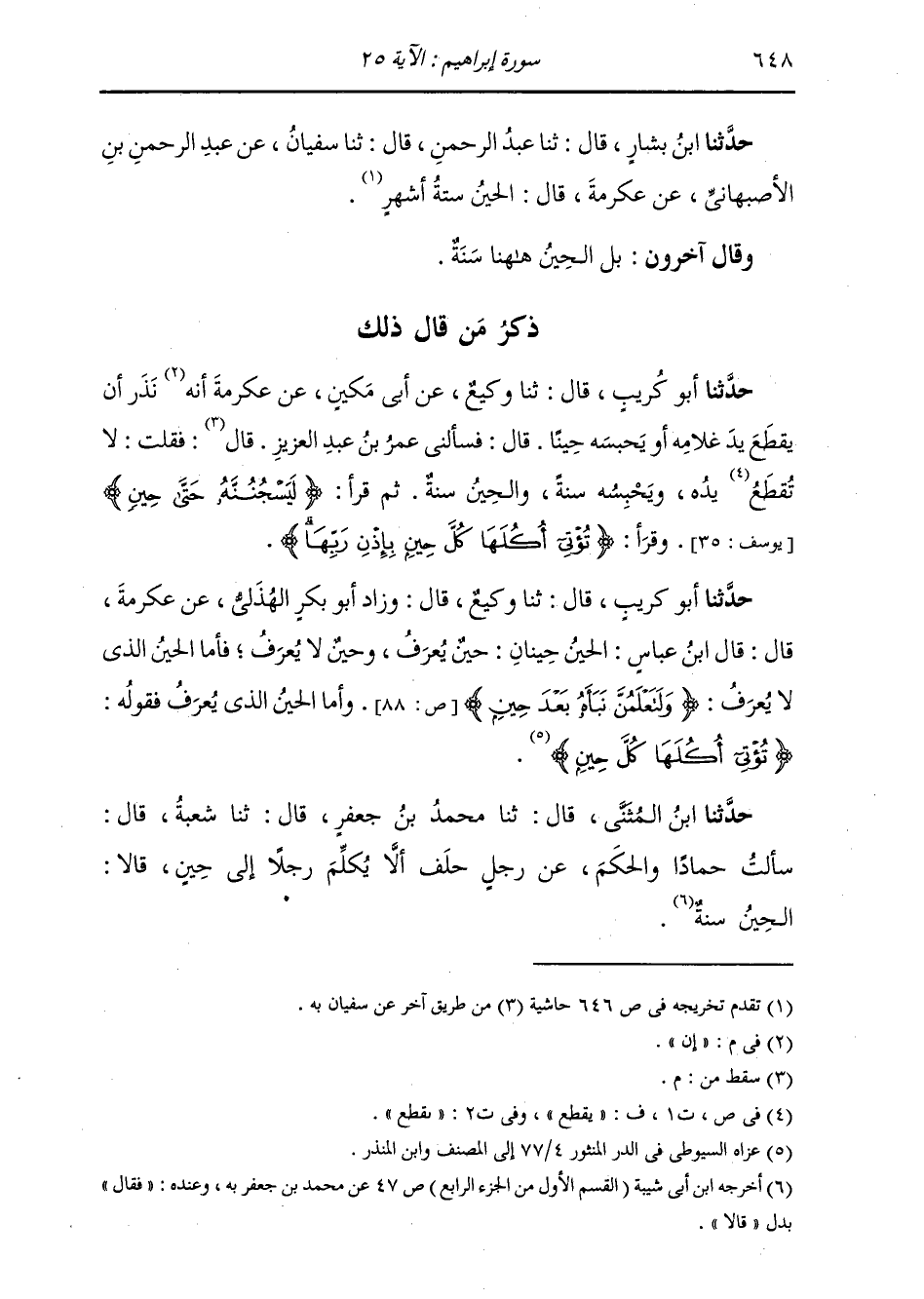 حَدَّثَنَا أَبُو كُرَيْبٍ، قَالَ: ثنا وَكِيعٌ، قَالَ: وَزَادَ أَبُو بَكْرٍ الْهُذَلِيُّ، عَنْ عِكْرِمَةَ، قَالَ: قَالَ ابْنُ عَبَّاسٍ: " §الْحِينُ حِينَانِ: حِينٌ يُعْرَفُ، وَحِينٌ لَا يُعْرَفُ، فَأَمَّا الْحِينُ الَّذِي لَا يُعْرَفُ: {وَلَتَعْلَمُنَّ نَبَأَهُ بَعْدَ حِينٍ} [ص: 88] وَأَمَّا الْحِينُ الَّذِي يُعْرَفُ فَقَوْلُهُ: {تُؤْتِي أُكُلَهَا كُلَّ حِينٍ بِإِذْنِ رَبِّهَا} [إبراهيم: 25] "