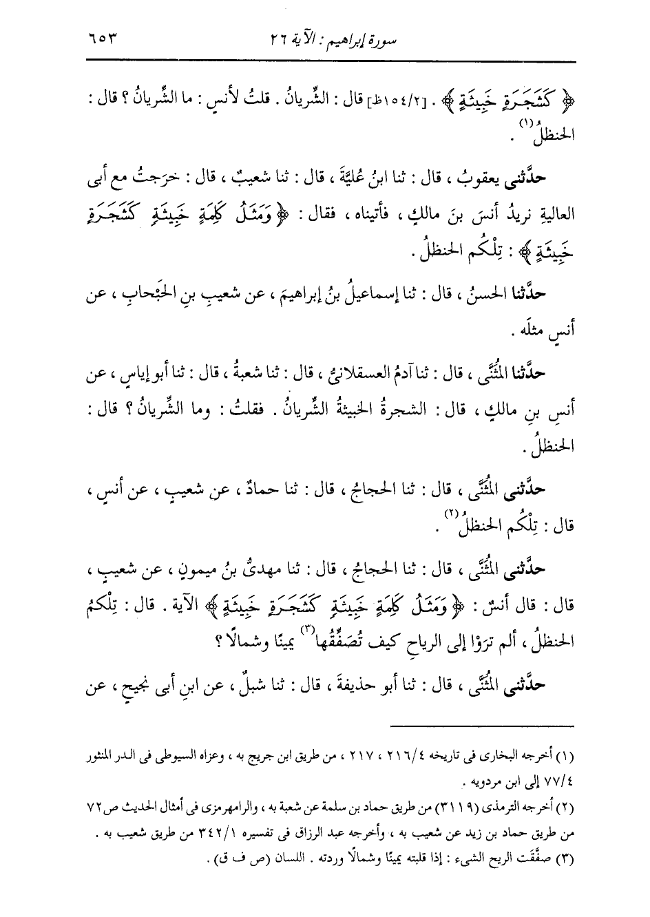 حَدَّثَنِي يَعْقُوبُ قَالَ: ثنا ابْنُ عُلَيَّةَ قَالَ: ثنا شُعَيْبٌ قَالَ: خَرَجْتُ مَعَ أَبِي الْعَالِيَةِ نُرِيدُ أَنَسَ بْنَ مَالِكٍ، فَأَتَيْنَاهُ، فَقَالَ: " {§وَمَثَلُ كَلِمَةٍ خَبِيثَةٍ كَشَجَرَةٍ خَبِيثَةٍ} [إبراهيم: 26] تِلْكُمُ الْحَنْظَلُ ". حَدَّثَنَا الْحَسَنُ قَالَ: ثنا إِسْمَاعِيلُ بْنُ إِبْرَاهِيمَ، عَنْ شُعَيْبِ بْنِ الْحَبْحَابِ، عَنْ أَنَسٍ، مِثْلَهُ