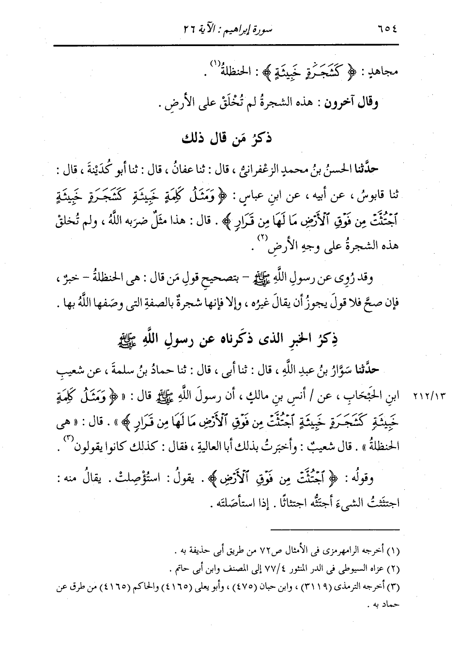 ذِكْرُ مَنْ قَالَ ذَلِكَ: حَدَّثَنَا الْحَسَنُ بْنُ مُحَمَّدٍ الزَّعْفَرَانِيُّ، قَالَ: ثنا عَفَّانُ، قَالَ: ثنا أَبُو كُدَيْنَةَ، قَالَ: ثنا قَابُوسُ، عَنْ أَبِيهِ، عَنِ ابْنِ عَبَّاسٍ: {§وَمَثَلُ كَلِمَةٍ خَبِيثَةٍ كَشَجَرَةٍ خَبِيثَةٍ اجْتُثَّتْ مِنْ فَوْقِ الْأَرْضِ مَا لَهَا مِنْ قَرَارِ} [إبراهيم: 26] قَالَ: «هَذَا مَثَلٌ ضَرَبَهُ اللَّهُ، وَلَمْ تُخْلَقْ هَذِهِ الشَّجَرَةُ عَلَى وَجْهِ الْأَرْضِ» وَقَدْ رُوِيَ عَنْ رَسُولِ اللَّهِ صَلَّى اللهُ عَلَيْهِ وَسَلَّمَ بِتَصْحِيحِ قَوْلِ مَنْ قَالَ: هِيَ الْحَنْظَلَةُ خَبَرٌ، فَإِنْ صَحَّ فَلَا قَوْلَ يَجُوزُ أَنْ يُقَالَ غَيْرُهُ، وَإِلَّا فَإِنَّهَا شَجَرَةٌ بِالصِّفَةِ الَّتِي وَصَفَهَا اللَّهُ بِهَا. ذِكْرُ الْخَبَرِ الَّذِي ذَكَرْنَاهُ عَنْ رَسُولِ اللَّهِ صَلَّى اللهُ عَلَيْهِ وَسَلَّمَ