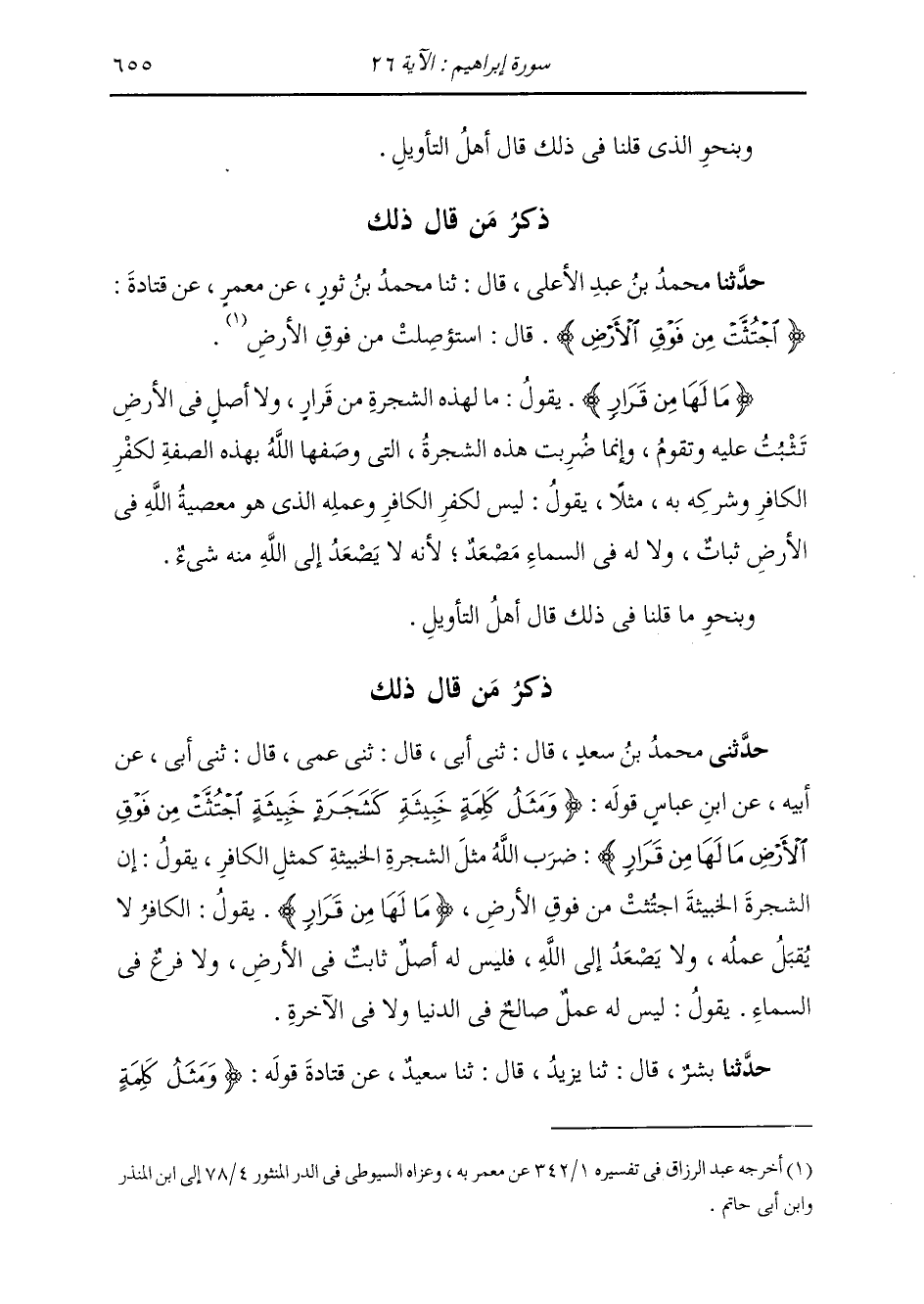 ذِكْرُ مَنْ قَالَ ذَلِكَ: حَدَّثَنَا مُحَمَّدُ بْنُ عَبْدِ الْأَعْلَى، قَالَ: ثنا مُحَمَّدُ بْنُ ثَوْرٍ، عَنْ مَعْمَرٍ، عَنْ قَتَادَةَ: {§اجْتُثَّتْ مِنْ فَوْقِ الْأَرْضِ} [إبراهيم: 26] قَالَ: " اسْتُؤْصِلَتْ مِنْ فَوْقِ الْأَرْضِ {مَا لَهَا مِنْ قَرَارِ} [إبراهيم: 26] يَقُولُ: مَا لِهَذِهِ الشَّجَرَةِ مِنْ قَرَارِ وَلَا أَصْلٍ فِي الْأَرْضِ تَنْبُتُ عَلَيْهِ وَتَقُومُ، وَإِنَّمَا ضُرِبَتْ هَذِهِ الشَّجَرَةُ الَّتِي وَصَفَهَا اللَّهُ بِهَذِهِ الصِّفَةِ لِكُفْرِ الْكَافِرِ وَشِرْكِهِ بِهِ مَثَلًا، يَقُولُ: «لَيْسَ لِكُفْرِ الْكَافِرِ وَعَمَلِهِ الَّذِي هُوَ مَعْصِيَةُ اللَّهِ فِي الْأَرْضِ ثَبَاتٌ، وَلَا لَهُ فِي السَّمَاءِ مَصْعَدٌ، لِأَنَّهُ لَا يَصْعَدُ إِلَى اللَّهِ مِنْهُ شَيْءٌ» . وَبِنَحْوِ مَا قُلْنَا فِي ذَلِكَ قَالَ أَهْلُ التَّأْوِيلِ