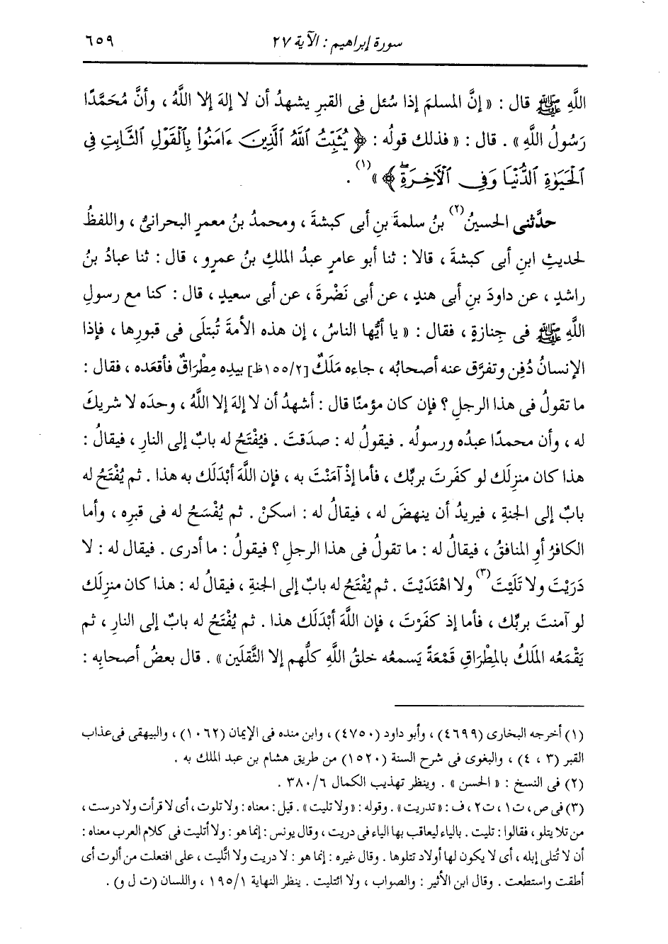 وَحَدَّثَنِي الْحُسَيْنُ بْنُ سَلَمَةَ بْنِ أَبِي كَبْشَةَ، وَمُحَمَّدُ بْنُ مَعْمَرٍ الْبَحْرَانِيُّ، وَاللَّفْظُ لِحَدِيثِ ابْنِ أَبِي كَبْشَةَ، قَالَا: ثنا أَبُو عَامِرٍ عَبْدُ الْمَلِكِ بْنُ عَمْرٍو، قَالَ: ثنا عَبَّادُ بْنُ رَاشِدٍ، عَنْ دَاوُدَ بْنِ أَبِي هِنْدٍ، عَنْ أَبِي نَضْرَةَ، عَنْ أَبِي سَعِيدٍ، قَالَ: كُنَّا مَعَ رَسُولِ اللَّهِ صَلَّى اللهُ عَلَيْهِ وَسَلَّمَ فِي جِنَازَةٍ فَقَالَ: " يَا أَيُّهَا النَّاسُ، إِنَّ §هَذِهِ الْأُمَّةَ تُبْتَلَى فِي قُبُورِهَا، فَإِذَا الْإِنْسَانُ دُفِنَ وَتَفَرَّقَ عَنْهُ أَصْحَابُهُ، جَاءَهُ مَلَكٌ بِيَدِهِ مِطْرَاقٌ فَأَقْعَدَهُ فَقَالَ: مَا تَقُولُ فِي هَذَا الرَّجُلِ؟ فَإِنْ كَانَ مُؤْمِنًا قَالَ: أَشْهَدُ أَنْ لَا إِلَهَ إِلَّا اللَّهُ، وَحْدَهُ لَا شَرِيكَ لَهُ، وَأَنَّ مُحَمَّدًا عَبْدُهُ وَرَسُولُهُ فَيَقُولُ لَهُ: صَدَقْتَ فَيُفْتَحُ لَهُ بَابٌ إِلَى النَّارِ، فَيُقَالُ: هَذَا مَنْزِلُكَ لَوْ كَفَرْتَ بِرَبِّكَ، فَأَمَّا إِذَا آمَنْتَ بِهِ، فَإِنَّ اللَّهَ أَبْدَلَكَ بِهِ هَذَا، ثُمَّ يُفْتَحُ لَهُ بَابٌ إِلَى الْجَنَّةِ، فَيُرِيدُ أَنْ يَنْهَضَ لَهُ، فَيُقَالُ لَهُ: اسْكُنْ ثُمَّ يُفْسَحُ لَهُ فِي قَبْرِهِ، وَأَمَّا الْكَافِرُ أَوِ الْمُنَافِقُ، فَيُقَالُ لَهُ مَا تَقُولُ فِي هَذَا الرَّجُلِ؟ فَيَقُولُ: مَا أَدْرِي، فَيُقَالُ لَهُ: لَا دَرَيْتَ، وَلَا تَلَيْتَ، وَلَا اهْتَدَيْتَ، ثُمَّ يُفْتَحُ لَهُ بَابٌ إِلَى الْجَنَّةِ، فَيُقَالُ لَهُ: هَذَا كَانَ مَنْزِلُكَ لَوْ آمَنْتَ بِرَبِّكَ، فَأَمَّا إِذْ كَفَرْتَ فَإِنَّ اللَّهَ أَبْدَلَكَ هَذَا، ثُمَّ يُفْتَحُ لَهُ بَابٌ إِلَى النَّارِ، ثُمَّ يَقْمَعُهُ الْمَلِكُ بِالْمِطْرَاقِ قَمْعَةً يَسْمَعُهُ خَلْقُ اللَّهِ كُلُّهُمْ إِلَّا الثَّقَلَيْنِ " قَالَ بَعْضُ أَصْحَابِهِ: -[660]- يَا رَسُولَ اللَّهِ، مَا مِنَّا أَحَدٌ يَقُومُ عَلَى رَأْسِهِ مَلَكٌ بِيَدِهِ مِطْرَاقٌ إِلَّا هِيلَ عِنْدَ ذَلِكَ؟ فَقَالَ رَسُولُ اللَّهِ صَلَّى اللهُ عَلَيْهِ وَسَلَّمَ: {يُثَبِّتُ اللَّهُ الَّذِينَ آمَنُوا بِالْقَوْلِ الثَّابِتِ فِي الْحَيَاةِ الدُّنْيَا وَفِي الْآخِرَةِ، وَيُضِلُّ اللَّهُ الظَّالِمِينَ، وَيَفْعَلُ اللَّهُ مَا يَشَاءُ} [إبراهيم: 27] "
