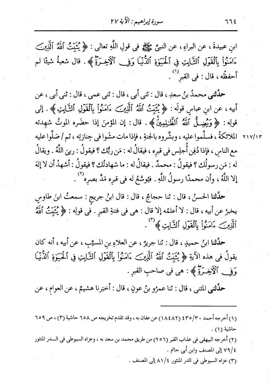 حَدَّثَنِي الْمُثَنَّى قَالَ: ثنا عَمْرُو بْنُ عَوْنٍ قَالَ: أَخْبَرَنَا هُشَيْمٌ، عَنِ الْعَوَّامِ، عَنِ -[665]- الْمُسَيِّبِ بْنِ رَافِعٍ: {§يُثَبِّتُ اللَّهُ الَّذِينَ آمَنُوا بِالْقَوْلِ الثَّابِتِ فِي الْحَيَاةِ الدُّنْيَا وَفِي الْآخِرَةِ} [إبراهيم: 27] قَالَ: «نَزَلَتْ فِي صَاحِبِ الْقَبْرِ» . حَدَّثَنَا أَحْمَدُ قَالَ: ثنا أَبُو أَحْمَدَ قَالَ: ثنا عَبَّادُ بْنُ الْعَوَّامِ، عَنِ الْعَلَاءِ بْنِ الْمُسَيَّبِ، عَنْ أَبِيهِ الْمُسَيِّبِ بْنِ رَافِعٍ نَحْوَهُ